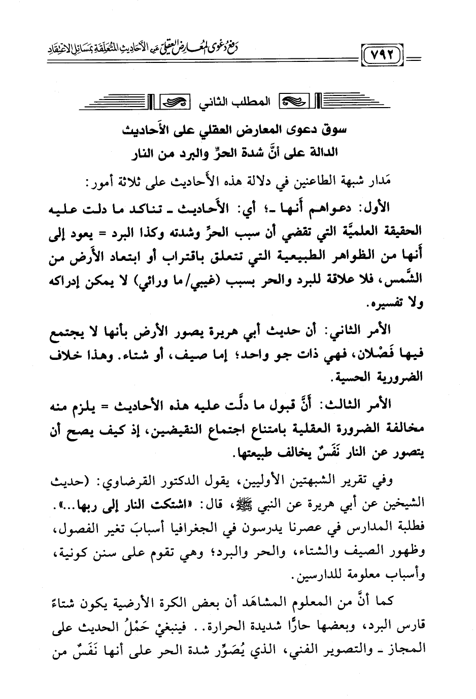 وفي تقرير الشبهتين الأوليين، يقول الدكتور القرضاوي: «حديث الشيخين عن أبي هريرة عن النبي - صلى الله عليه وسلم -، قال: (اشتكت النار إلى ربها ... ). فطلبة المدارس في عصرنا يدرسون في الجغرافيا أسبابَ تغير الفصول، وظهور الصيف والشتاء، والحر والبرد؛ وهي تقوم على سنن كونية، وأسباب معلومة للدارسين.