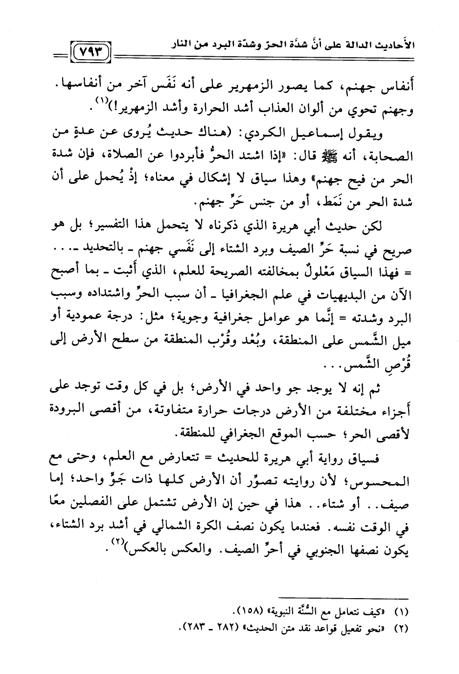 لكن حديث أبي هريرة الذي ذكرناه لا يتحمل هذا التفسير؛ بل هو صريح في نسبة حَرِّ الصيف وبرد الشتاء إلى نَفَسي جهنم - بالتحديد - ... = فهذا السياق مَعْلولٌ بمخالفته الصريحة للعلم، الذي أَثبت - بما أصبح الآن من البديهيات في علم الجغرافيا - أن سبب الحرِّ واشتداده وسبب البرد وشدته = إنَّما هو عوامل جغرافية وجوية؛ مثل: درجة عمودية أو ميل الشَّمس على المنطقة، وبُعْد وقُرْب المنطقة من سطح الأرض إلى قُرْصِ الشَّمس ...