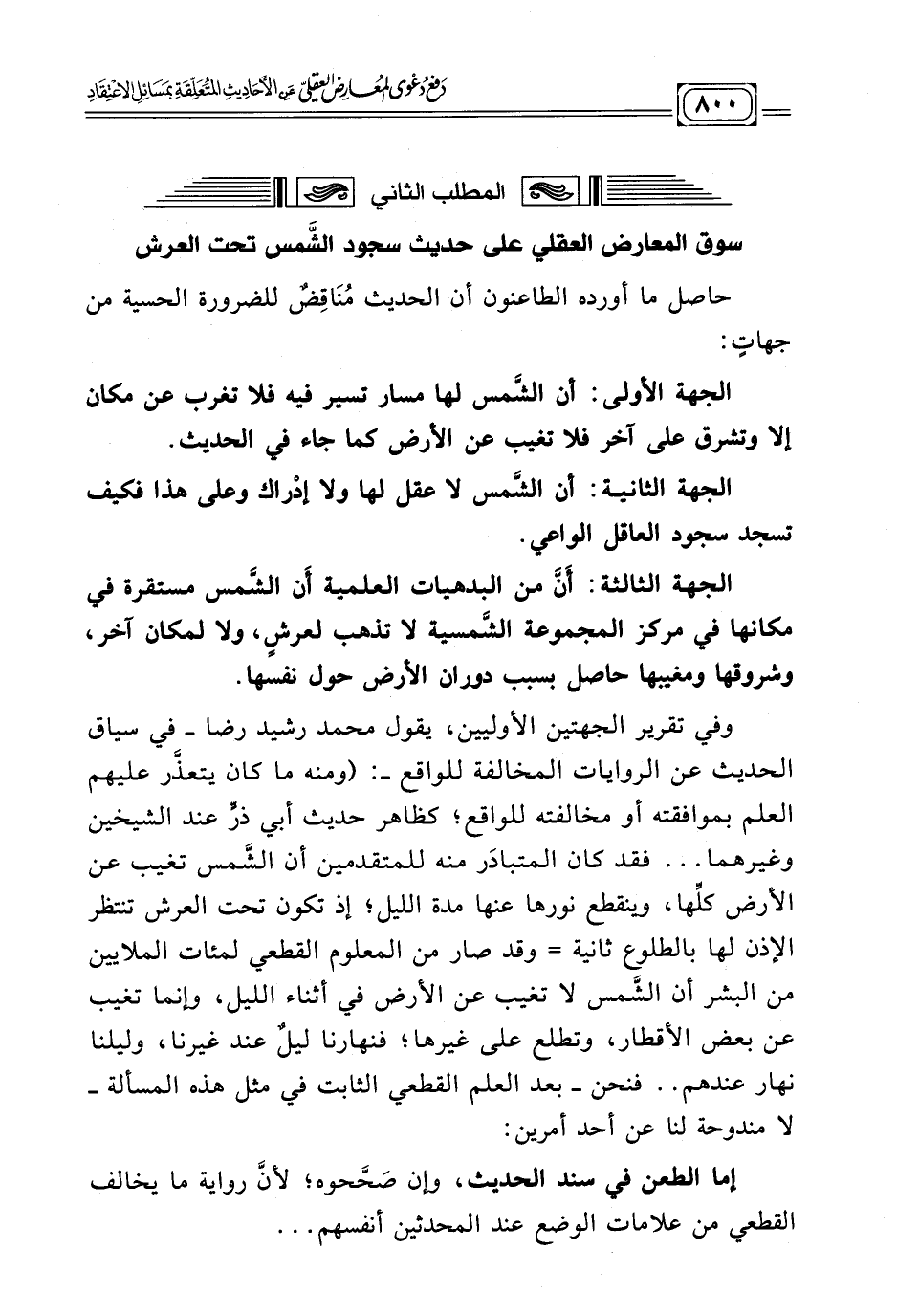وفي تقرير الجهتين الأوليين، يقول محمد رشيد رضا -في سياق الحديث عن الروايات المخالفة للواقع -: (ومنه ما كان يتعذّر عليهم العلم بموافقته أو مخالفته للواقع؛ كظاهر حديث أبي ذرٍّ عند الشيخين وغيرهما ... فقد كان المتبادَر منه للمتقدمين أن الشَّمس تغيب عن الأرض كلّها، وينقطع نورها عنها مدة الليل؛ إذ تكون تحت العرش تنتظر الإذن لها بالطلوع ثانية = وقد صار من المعلوم القطعي لمئات الملايين من البشر أن الشَّمس لا تغيب عن الأرض في أثناء الليل، وإنما تغيب عن بعض الأقطار، وتطلع على غيرها؛ فنهارنا ليلٌ عند غيرنا، وليلنا نهار عندهم .. فنحن - بعد العلم القطعي الثابت في مثل هذه المسألة- لا مندوحة لنا عن أحد أمرين: