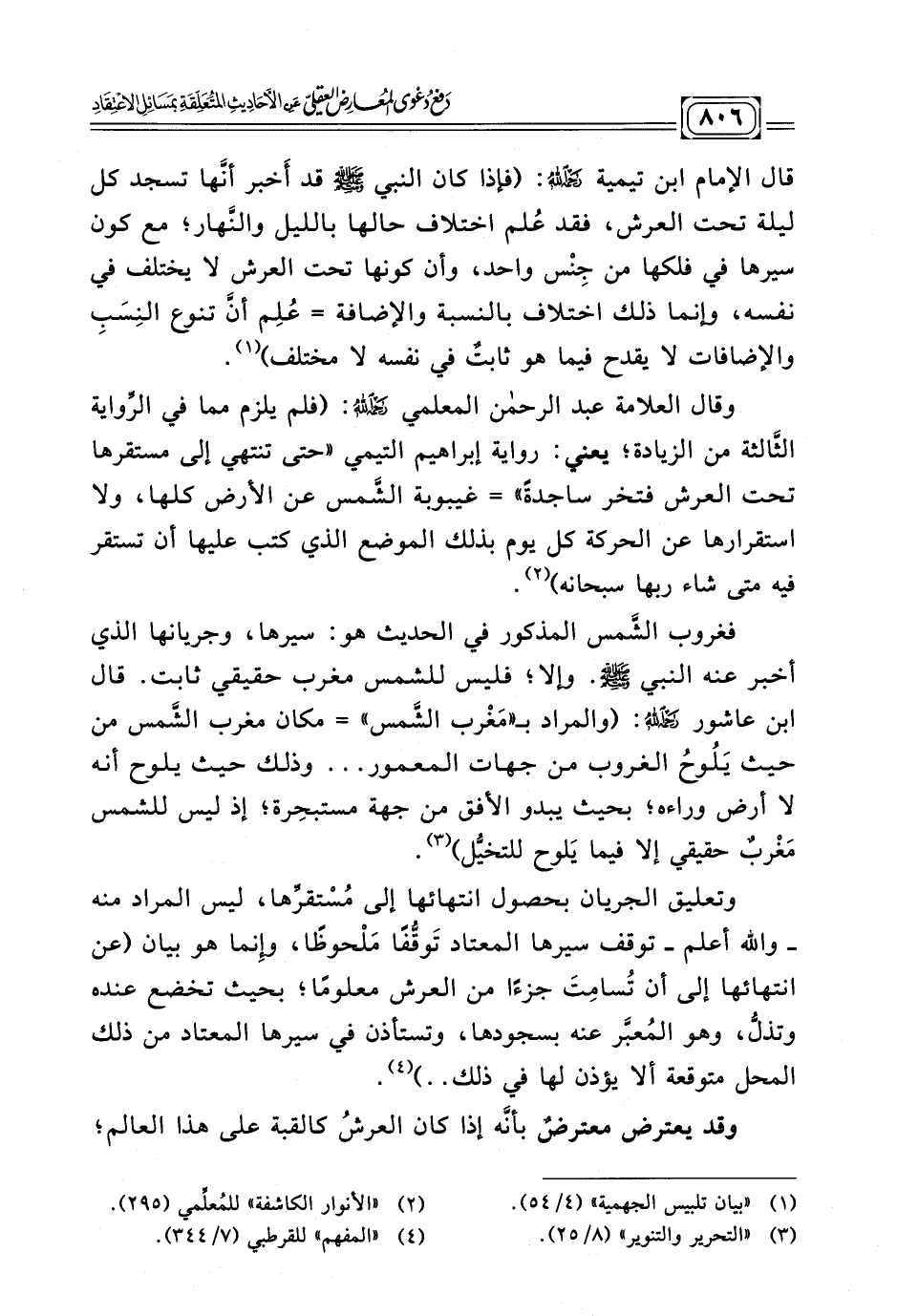 وقال العلامة عبد الرحمن المعلمي - رحمه الله -: (فلم يلزم مما في الرّواية الثَّالثة من الزيادة -يعني: رواية إبراهيم التميمي (حتى تنتهي إلى مستقرها تحت العرش فتخر ساجدةً) = غيبوبة الشَّمس عن الأرض كلها، ولا استقرارها عن الحركة كل يوم بذلك الموضع الذي كتب عليها أن تستقر فيه متى شاء ربها سبحانه) (¬٢) .