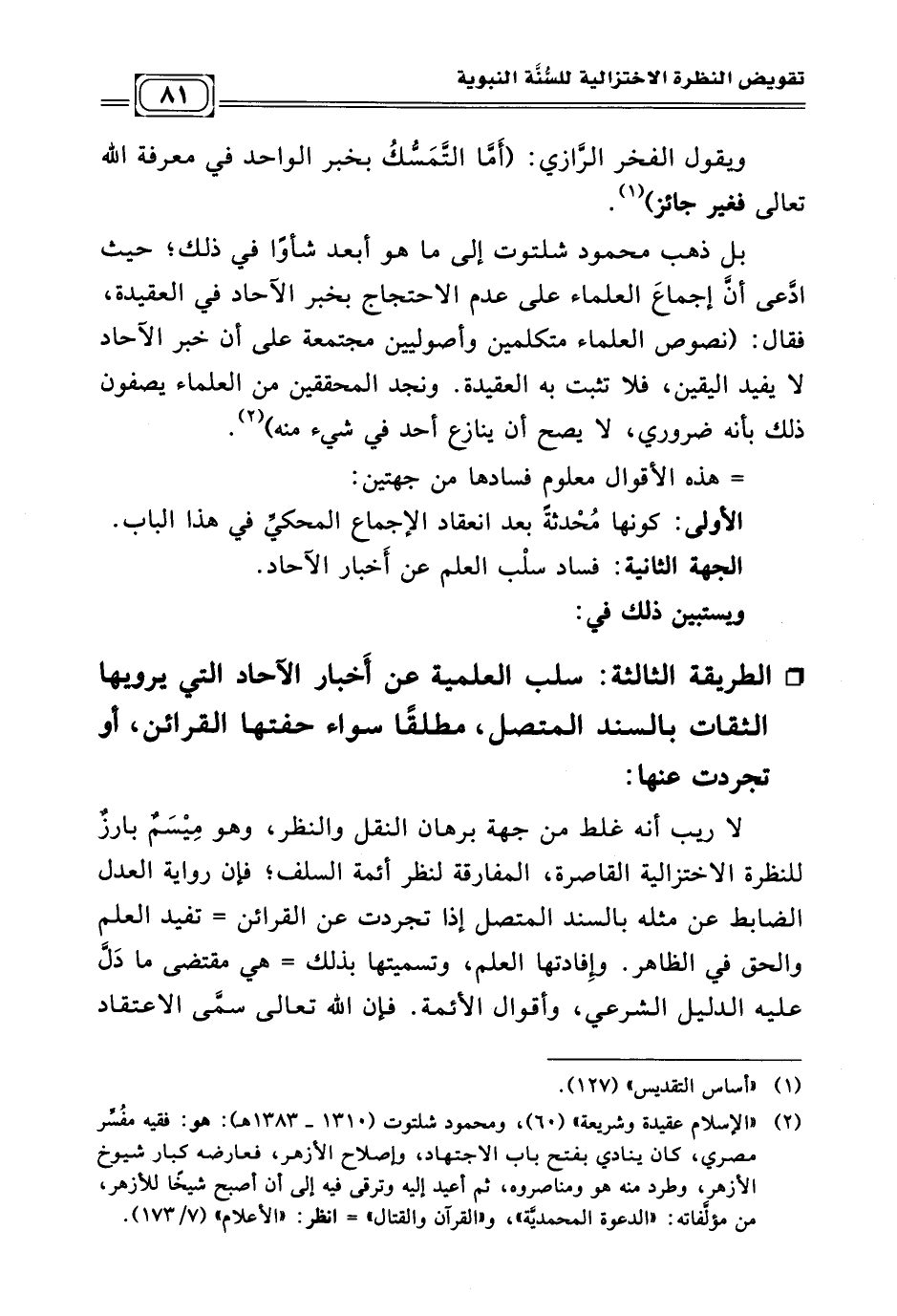 بل ذهب محمود شلتوت إلى ما هو أبعد شأوًا في ذلك؛ حيث ادَّعى أنَّ إجماعَ العلماء على عدم الاحتجاج بخبر الآحاد في العقيدة، فقال: (نصوص العلماء متكلمين وأصوليين مجتمعة على أن خبر الآحاد لا يفيد اليقين، فلا تثبت به العقيدة. ونجد المحققين من العلماء يصفون ذلك بأنه ضروري، لا يصح أن ينازع أحد في شيء منه) (¬٢)