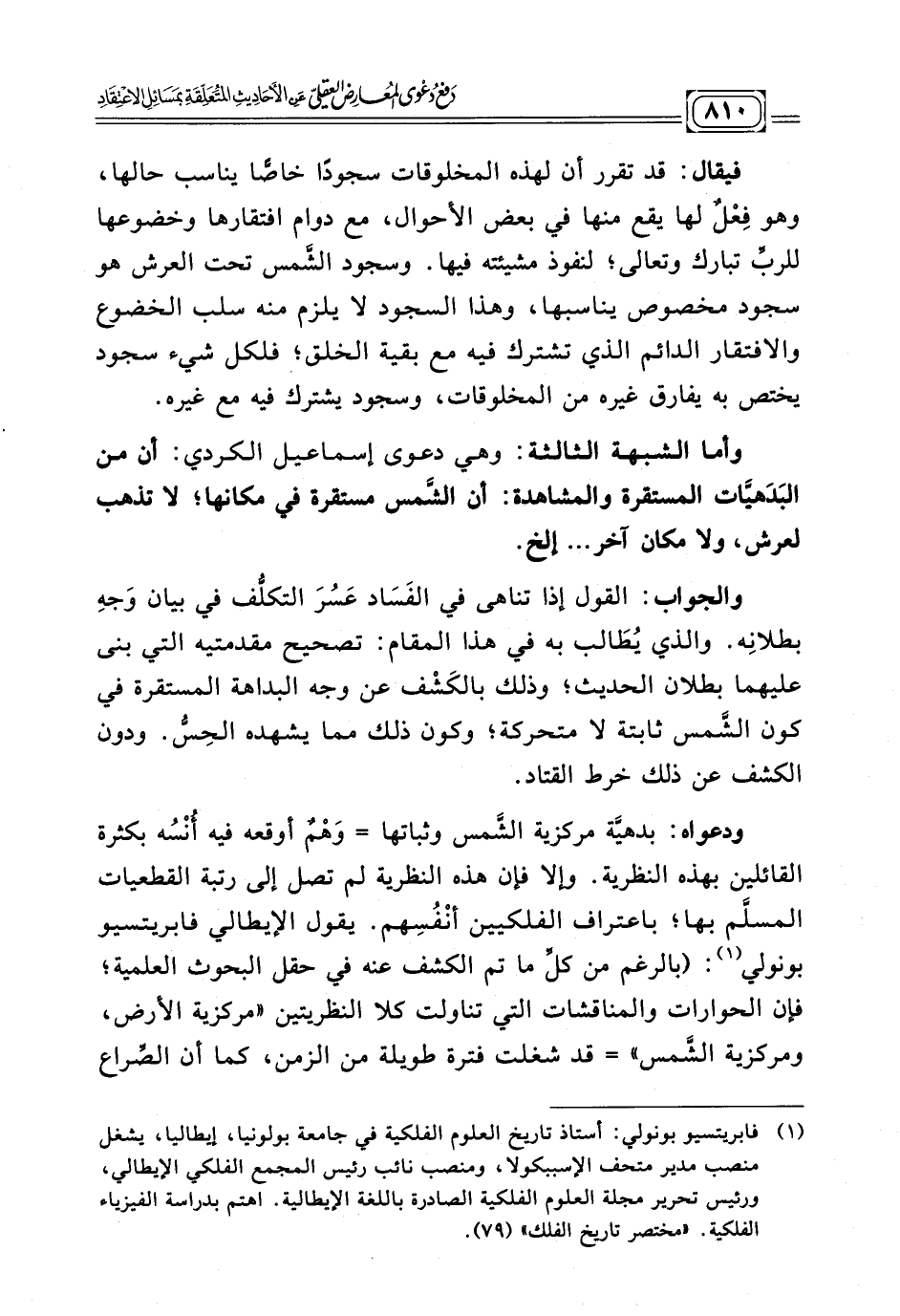 ودعواه: بدهيَّة مركزية الشَّمس وثباتها = وَهْمٌ أوقعه فيه أُنْسُه بكثرة القائلين بهذه النظرية. ألا فإن هذه النظرية لم تصل إلى رتبة القطعيات المسلم بها؛ باعتراف الفلكيين أنْفُسِهم. يقول الإيطالي فابريتسيو بونولي (¬١): (بالرغم من كلِّ ما تم الكشف عنه في حقل البحوث العلمية؛ فإن الحوارات والمناقشات التي تناولت كلا النظريتين " مركزية الأرض، ومركزية الشَّمس " = قد شغلت فترة طويلة من الزمن، كما أن الصِّراع