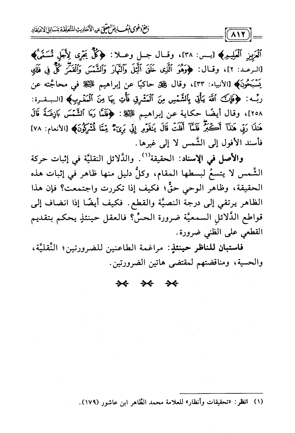 والأصل في الإسناد: الحقيقة (¬١) . والدَّلائل النقليَّة في إثبات حركة الشَّمس لا يتسعُ لبسطها المقام، وكلّ دليل منها ظاهر في إثبات هذه الحقيقة، وظاهر الوحي حقٌّ؛ فكيف إذا تكررت واجتمعت؟ فإن هذا الظاهر يرتقي إلى درجة النصيّة والقطع. فكيف أيضا إذا انضاف إلى قواطع الدَّلائلِ السمعيَّة ضرورة الحسِّ؟ فالعقل حينئذٍ يحكم بتقديم القطعي على الظني ضرورة.