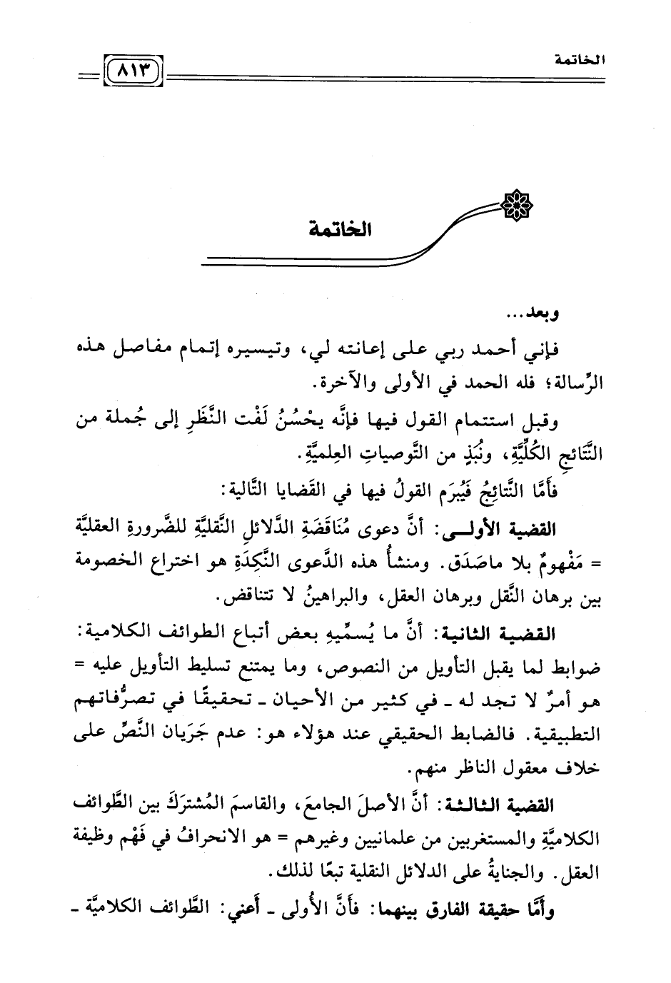 القضية الأولى: أَنَّ دعوى مُنَاقَضَةِ الدَّلائلِ النَّقليَّةِ للضَّرورةِ العقليَّة = مَفْهُومٌ بلا ما صَدَق. ومنشأُ هذه الدَّعوى النَّكِدَةِ هو اختراع الخصومة بين برهان النَّقل وبرهان العقل، والبراهينُ لا تتناقض.