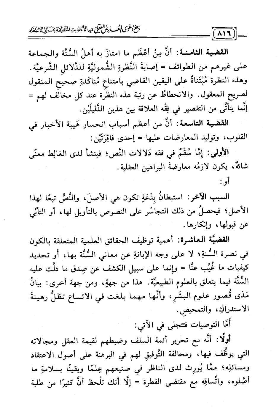 القضيَّة الثامنة: أنَّ من أعظَم ما امتار به أهل السُّنَّة والجماعة على غيرهم من الطوائف = إصابة النَّظرةِ الشُّموليَّةِ للدَّلائل الشَّرعيَّة. وهذه النظرة مُبتَنَاةٌ على اليقين القاضي بامتناع مُناكَدةِ صحيح المنقول الصريح المعقول. والانحطاطُ عن رتبة هذه النظرة عند كل مخالف لهم = إنَّما يتأتَّى من التقصير في فقه العلاقة بين هذين الدَّليلَيْن.
