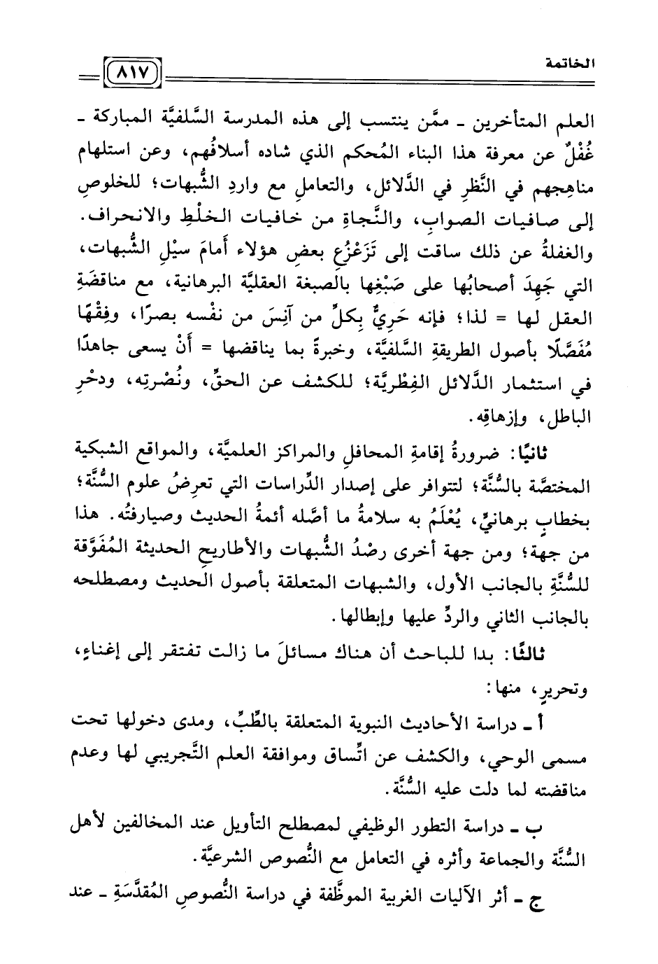 العلم المتأخرين - ممَّن ينتسب إلى هذه المدرسة السَّلفيَّة المباركة - غُفْلٌ عن معرفة هذا البناء المُحكم الذي شاده أسلافُهم، وعن استلهام مناهِجهم في النَّظر في الدَّلائل، والتعامل مع واردِ الشُّبهات؛ للخلوص إلى صافيات الصواب، والنَّجاة من خافيات الخلْطِ والانحراف. والغفلةُ عن ذلك ساقت إلى تَزَعْزُعِ بعض هؤلاء أَمام سَيْلِ الشُّبهات، التي جَهِدَ أصحابُها على صَبْغها بالصبغة العقليَّة البرهانية، مع مناقضَةِ العقل لها = لذا؛ فإنه حَرِيٌّ بِكلٍّ من آنِسَ من نفْسه بصرًا، وفِقْهًا مُفَصَّلًا بأُصول الطريقة السَّلفيَّة، وخبرةً بما يناقضها = أَنْ يسعى جاهدًا في استثمار الدَّلائل الفِطْريَّة؛ للكشف عن الحقِّ، ونُصْرتِه، ودحْرِ الباطل، وإزهاقِه.