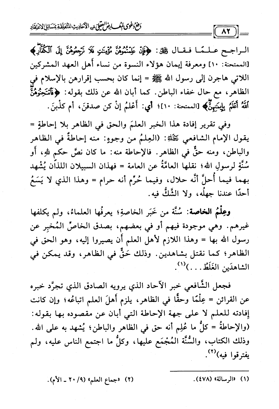 وفي تقرير إفادة هذا الخبر العلمَ والحق في الظاهر بلا إحاطةٍ = يقول الإمام الشافعي-: -: (العِلمُ من وجوهٍ: منه إحاطةٌ في الظاهر والباطن، ومنه حقٌ في الظاهر. فالإحاطة منه: ما كان نصَّ حكمٍ للّهِ، أَو سنةٍ لرسولِ الله؛ نقلها العامّةُ عن العامة = فهذان السبيلان اللذان يُشْهد بهما فيما أُحلّ أنّه حلال، وفيما حُرِّم أنه حرام = وهذا الذي لا يَسَعُ أحدًا عندنا جهلُه، ولا الشَّكَّ فيه.