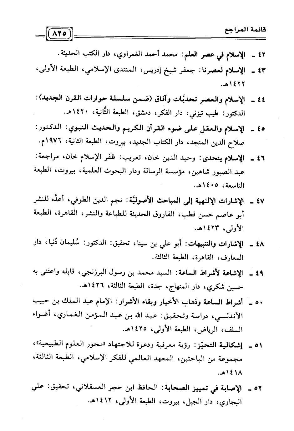 ٤٩ - الإشاعة الأشراط الساعة: السيد محمد بن رسول البرزنجي، قابله واعتنى به حسين شكري، دار المنهاج، جدة، الطبعة الثالثة، ١٤٢٦ ه.