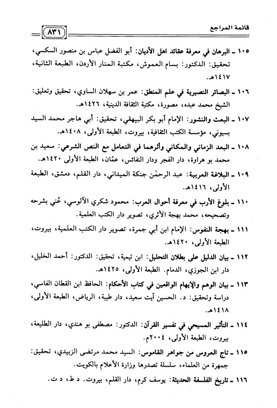 ١٠٥ - البرهان في معرفة عقائد اهل الأديان: أبو الفضل عباس بن منصور السكسي، تحقيق: الدكتور: بسام العموش، مكتبة المنار الأردن، الطبعة الثانية، ١٤١٧ ه.