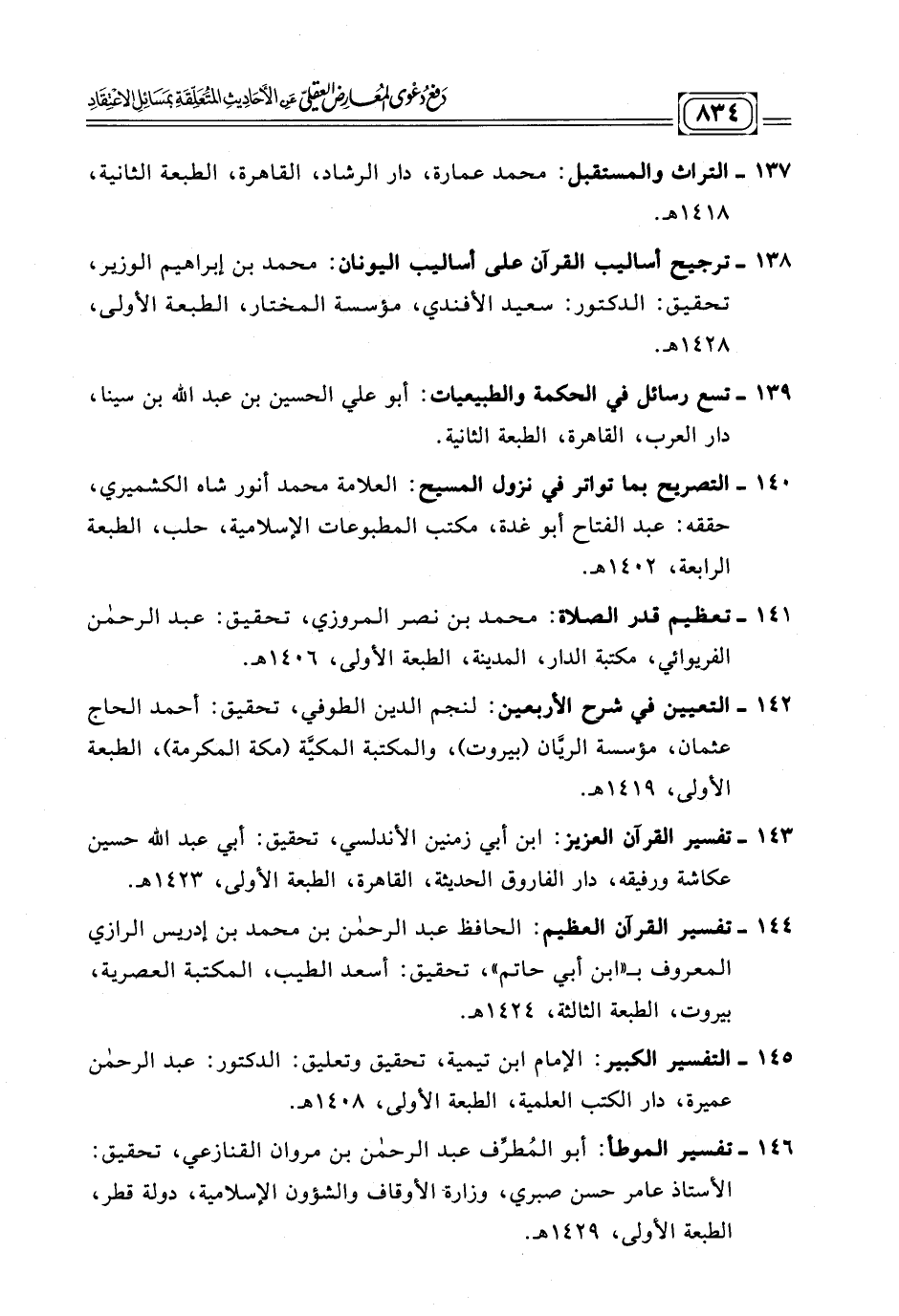 ١٤٠ - النصريح بما تواتر في نزول المسيح: العلامة محمد أنور شاه الكشميري، حققه: عبد الفتاح أبو غدة، مكتب المطبوعات الإسلامية، حلب، الطبعة الرابعة، ١٤٠٢ ه.