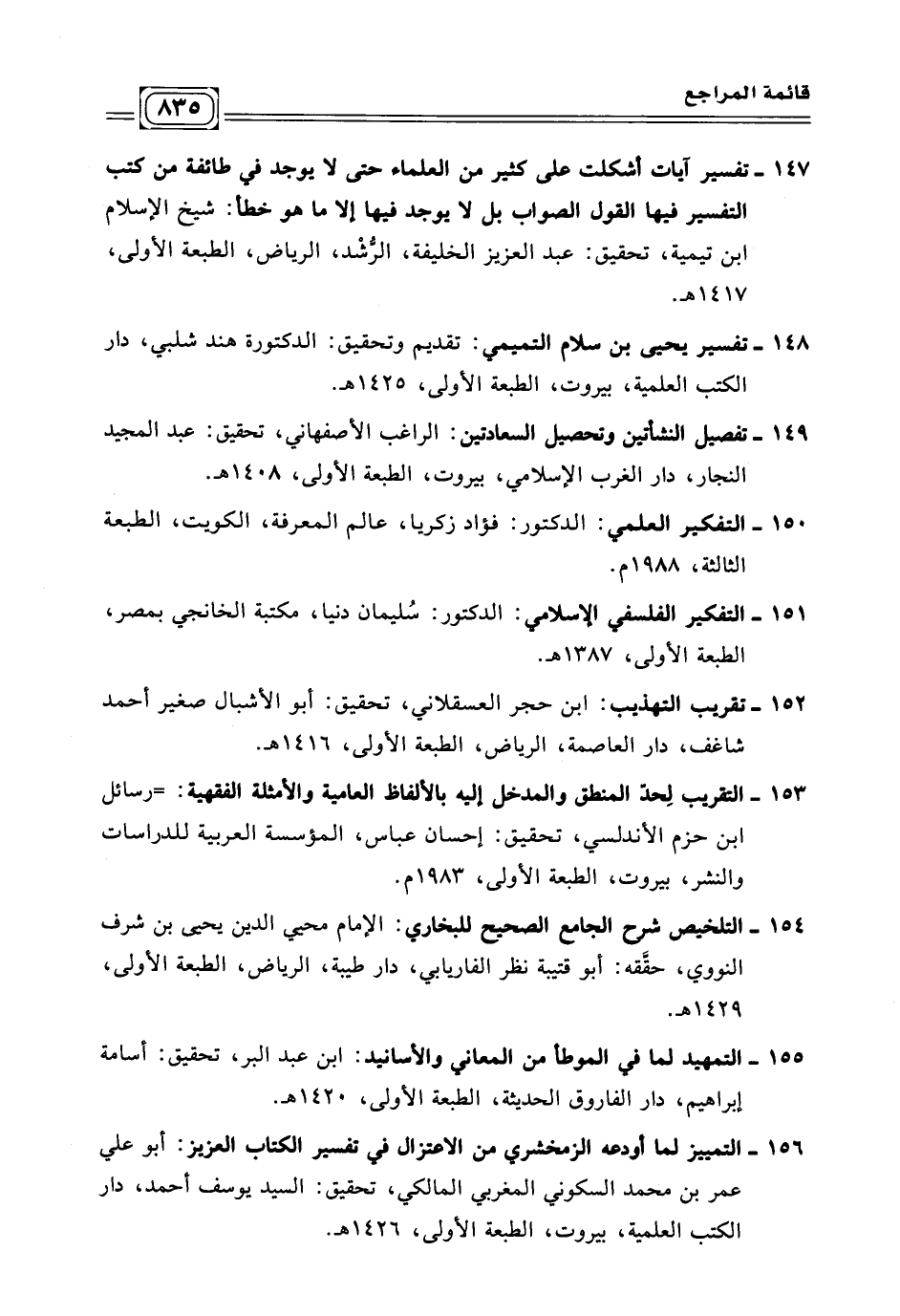 ١٤٩ - تفصيل النشاتين وتحصيل السعادتين: الراغب الأصفهاني، تحقيق: عبد المجيد النجار، دار الغرب الإسلامي، بيروت، الطبعة الأولى، ١٤٠٨ ه.