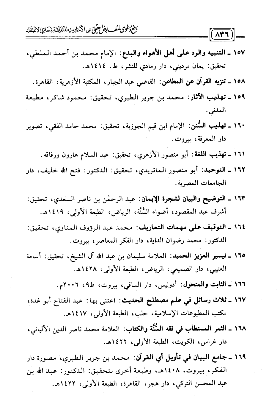 ١٥٧ - التنبيه والرد على أهل الأهواء والبدع: الإمام محمد بن أحمد الملطي، تحقيق: يمان مرديني، دار رمادي للنشر، ط. ١٤١٤ ه.