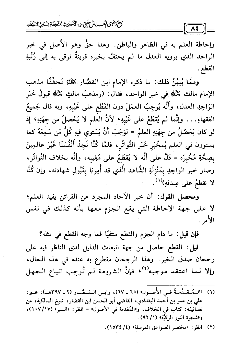 (¬١) "المُقدِّمةُ في الأُصول" (٦٥ - ٦٧) وابن القصَّار (؟ -٣٩٧ هـ):هو علي بن عمر بن أحمد البغدادي، القاضي أبو الحسن ابن القصَّار، شيخ المالكية، من تصانيفه: كتاب في الخلاف، و"المُقدمة في الأصول"=انظر: "السير" (١٧/ ١٠٧)،و"شجرة النور الزكيَّة" (١/ ٩٢)