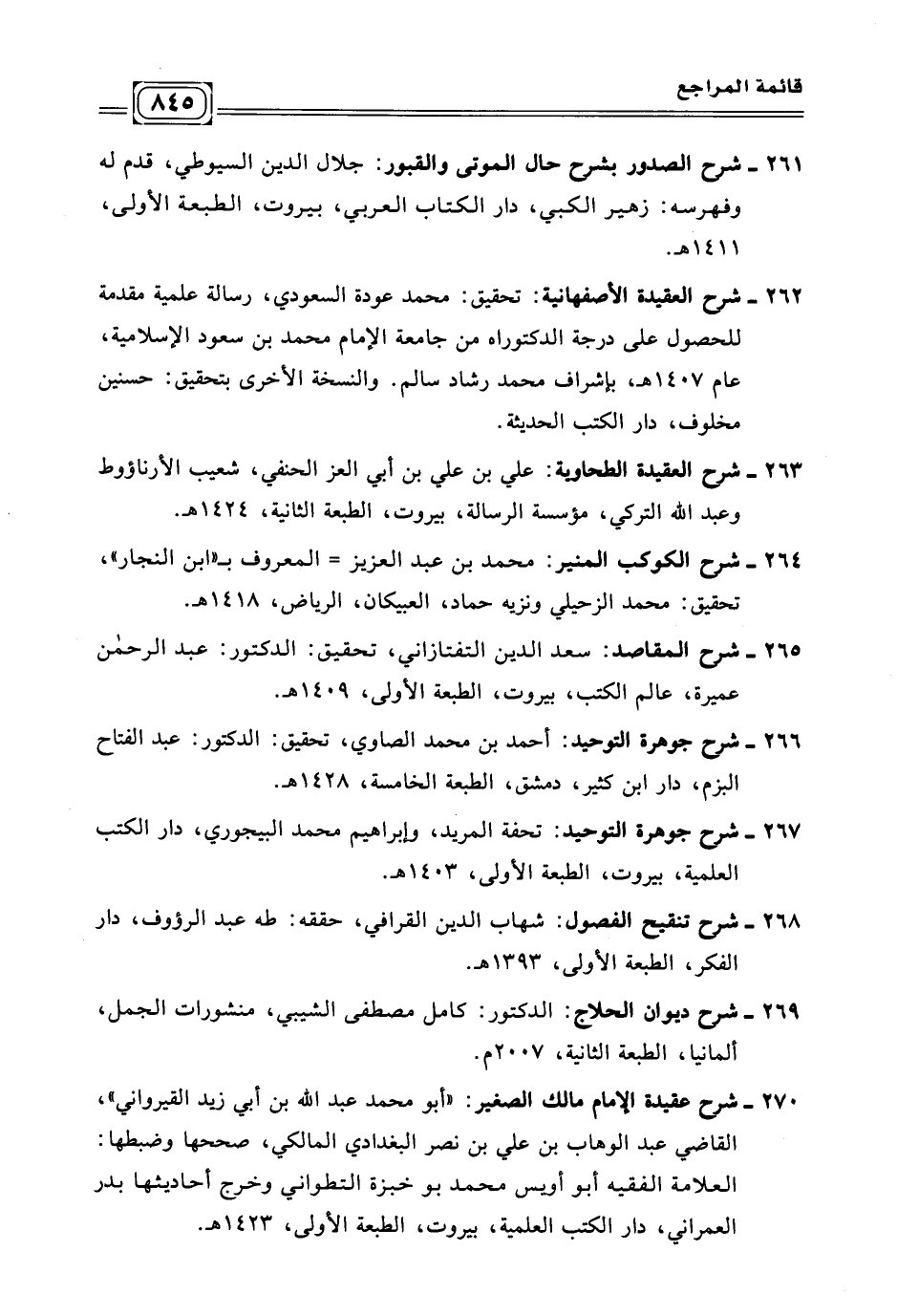 ٢٦٣ - شرح العقيدة الطحاوية: علي بن علي بن أبي العز الحنفي، شعيب الأرناؤوط وعبد الله التركي، مؤسسة الرِّسالة، بيروت، الطبعة الثانية، ١٤٢٦ ه.