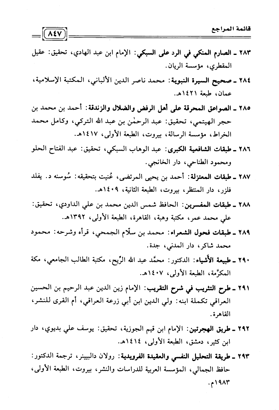 ٢٩٢ - طريق الهجرتين: الإمام ابن قيم الجوزية، تحقيق: يوسف علي بديوي، دار ابن كثير، دمشق، الطبعة الأولى، ١٤١٤ ه. ٢٩٣ - طريقة التحليل النفسي والعقيدة الفرويدية: رولان دالبينر، ترجمة الدكتور: حافظ الجمالي، المؤسسة العربية للدراسات والنشر، بيروت، الطبعة الأولى، ١٩٨٣ م.
