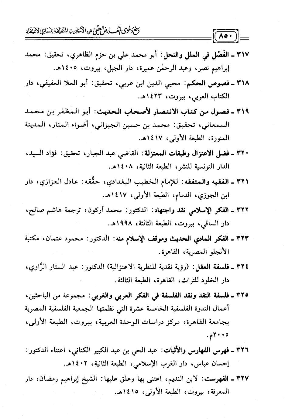 ٣١٧ - الفضل في الملل والنحل: أبو محمد علي بن حزم الظاهري، تحقيق: محمد إبراهيم نصر، وعبد الرحمن عميرة، دار الجبل، بيروت، ١٤٠٥ ه.