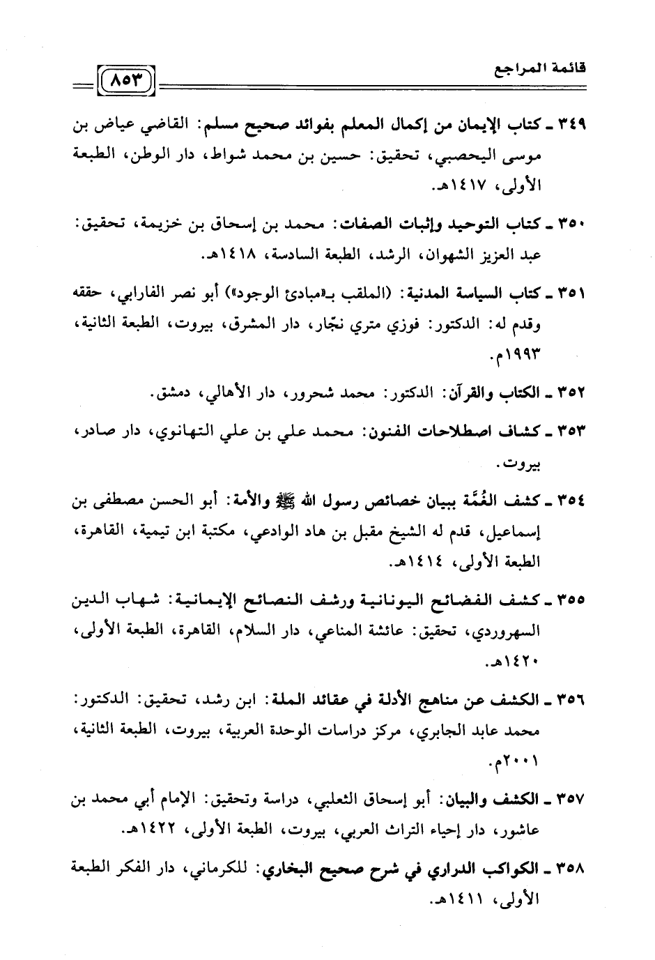٣٥٦ - الكشف عن مناهج الأدلة في عقائد الملة: ابن رشد، تحقيق: الدكتور: محمد عابد الجابري، مركز دراسات الوحدة العربية، بيروت، الطبعة الثانية، ٢٠٠١ م.