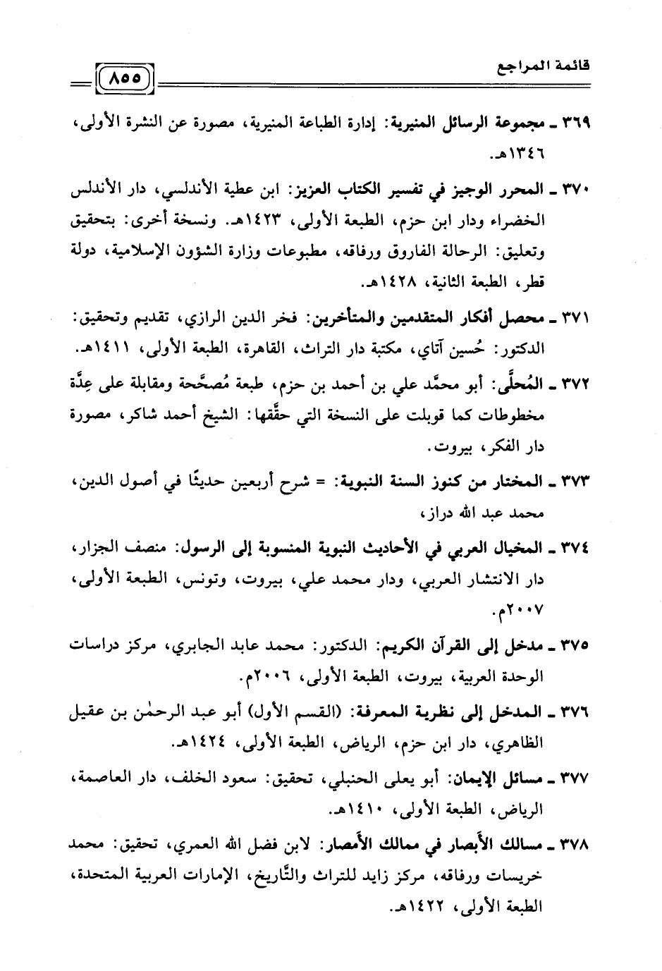 ٣٧٠ - المحرر الوجيز في تفسير الكتاب العزيز: ابن عطية الأندلسي، دار الأندلس الخضراء ودار ابن حزم، الطبعة الأولى، ١٤٢٣ ه. ونسخة أخرى: بتحقيق وتعليق: الرحالة الفاروق ورفاقه، مطبوعات وزارة الشؤون الإسلامية، دولة قطر، الطبعة الثانية، ١٤٢٨ ه.