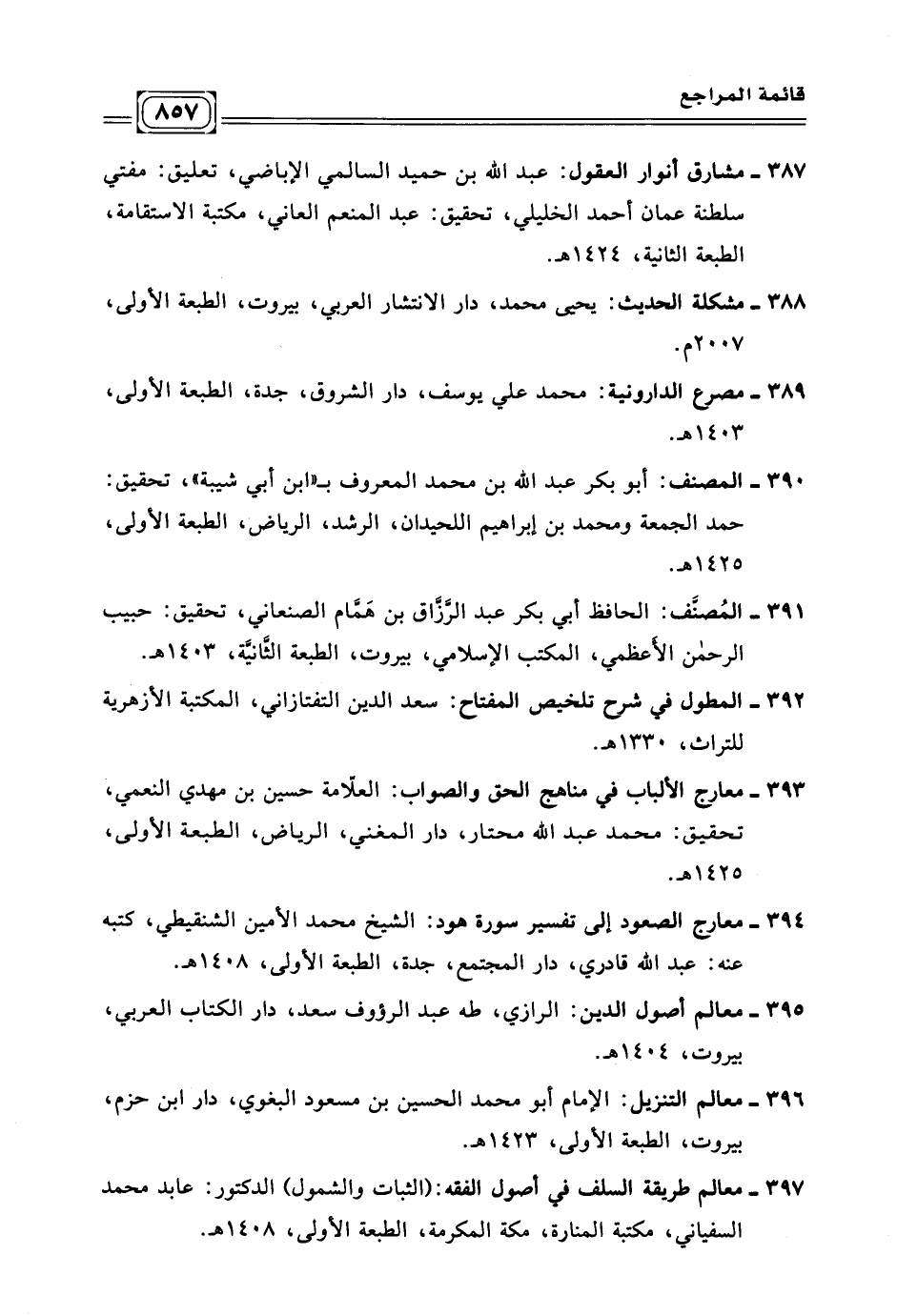 ٣٨٧ - مشارق أنوار العقول: عبد الله بن حميد السالمي الإباضي، تعليق: مفتي سلطنة عمان أحمد الخليلي، تحقيق: عبد المنعم العاني، مكتبة الاستقامة، الطبعة الثانية، ١٤٢٤ ه.