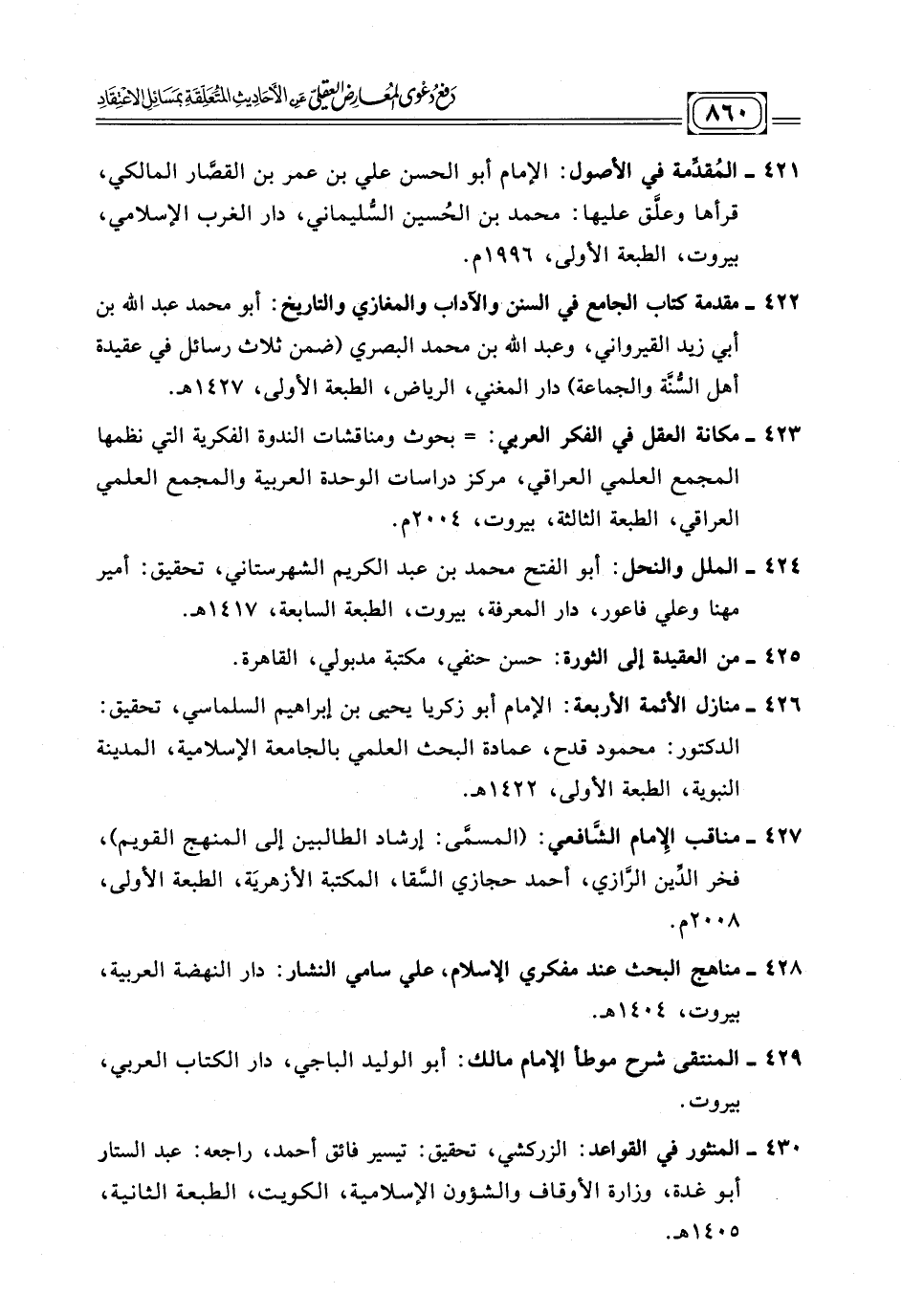 ٤٢٤ - الملل والنحل: أبو الفتح محمد بن عبد الكريم الشهرستاني، تحقيق: أمير مهنا وعلي فاعور، دار المعرفة، بيروت، الطبعة السابعة، ١٤١٧ ه.