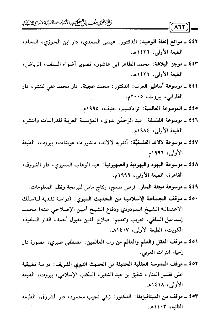 ٤٥٢ - موقف المدرسة العقلية الحديثة من الحديث النبوي الشريف: دراسة تطبيقية على تفسير المنار، شفيق بن عيد الشقير، المكتب الإسلامي، بيروت، الطبعة الأولى، ١٤١٨ ه.