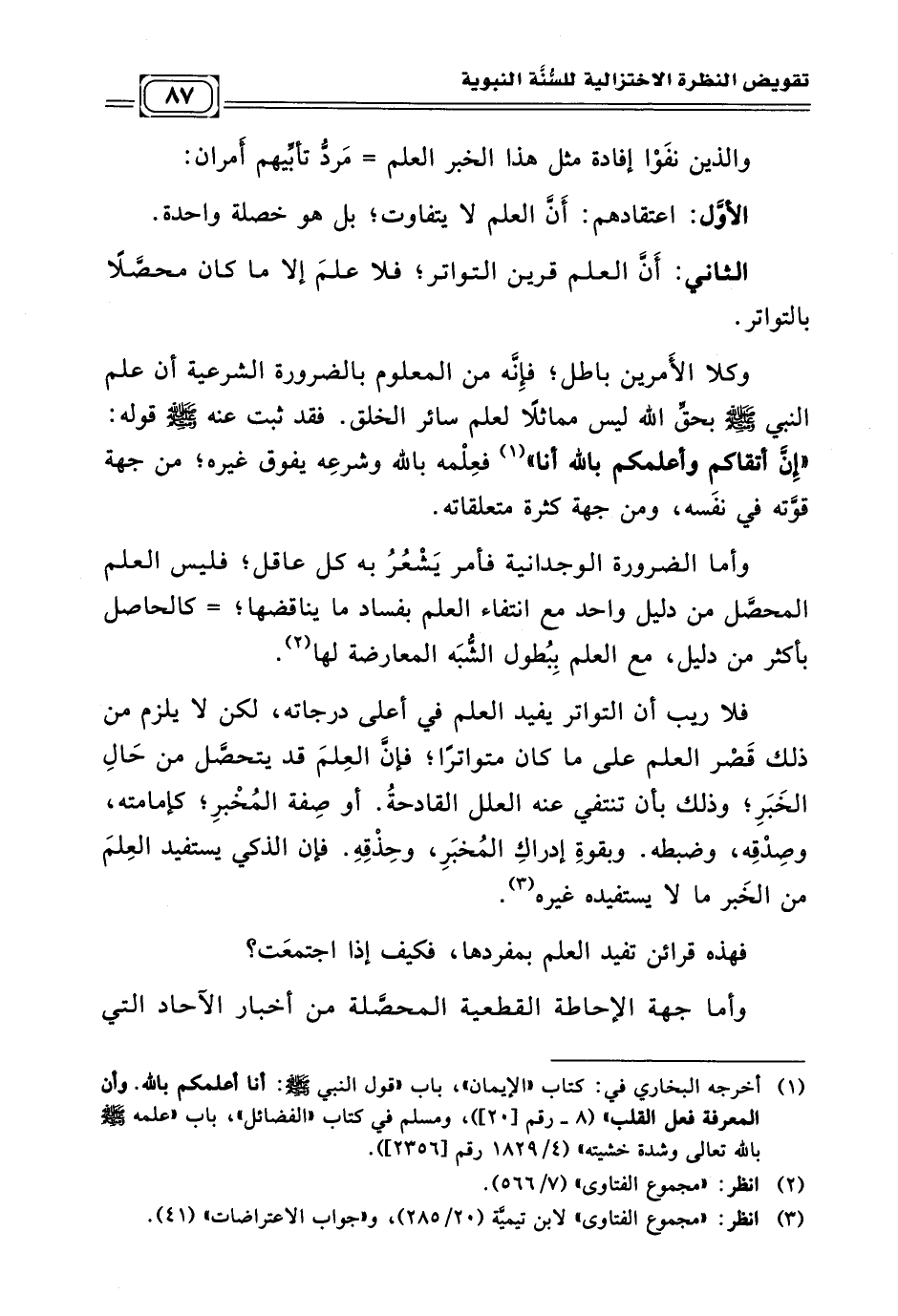 وكلا الأَمرين باطل؛ فإِنَّه من المعلوم بالضرورة الشرعية أن علم النبي - صلى الله عليه وسلم - بحقّ الله ليس مماثلًا لعلم سائر الخلق. فقد ثبت عنه - صلى الله عليه وسلم - قوله: (إِنَّ أتقاكم وأعلمكم بالله أنا) (¬١) فعِلْمه بالله وشرعِه يفوق غيره؛ من جهة قوَّته في نفَسه، ومن جهةكثرة متعلقاته.
