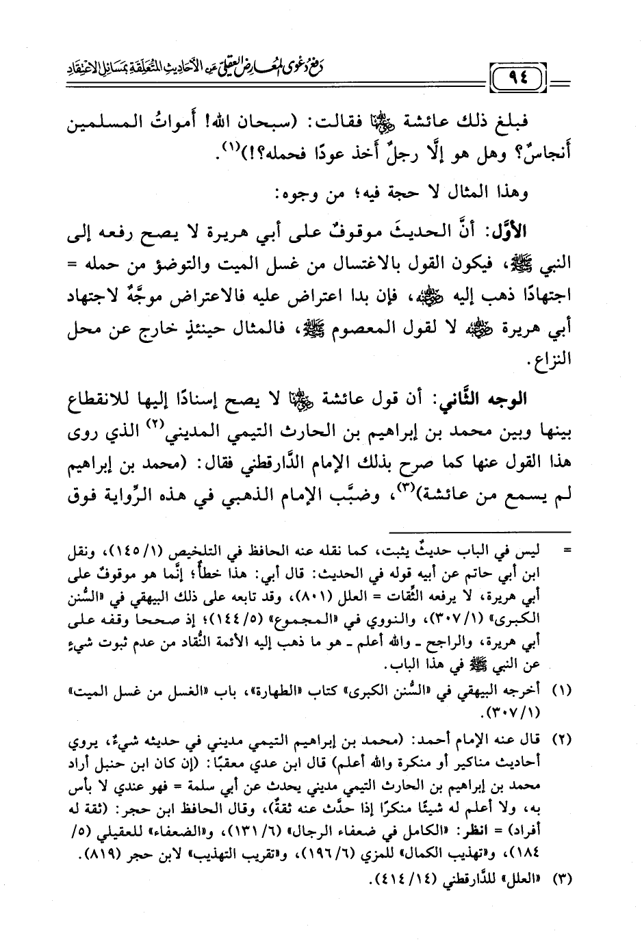 الأوَّل: أنَّ الحديثَ موقوفٌ على أبي هريرة لا يصح رفعه إلى النبي - صلى الله عليه وسلم - فيكون القول بالاغتسال من غسل الميت والتوضئ من حمله= اجتهادًا ذهب إليه - رضي الله عنه -، فإن بدا اعتراض عليه فالاعتراض موجَّهٌ لاجتهاد أبي هريرة - رضي الله عنه - لا لقول المعصوم - صلى الله عليه وسلم -،فالمثال حينئذٍ خارج عن محل النزاع.
