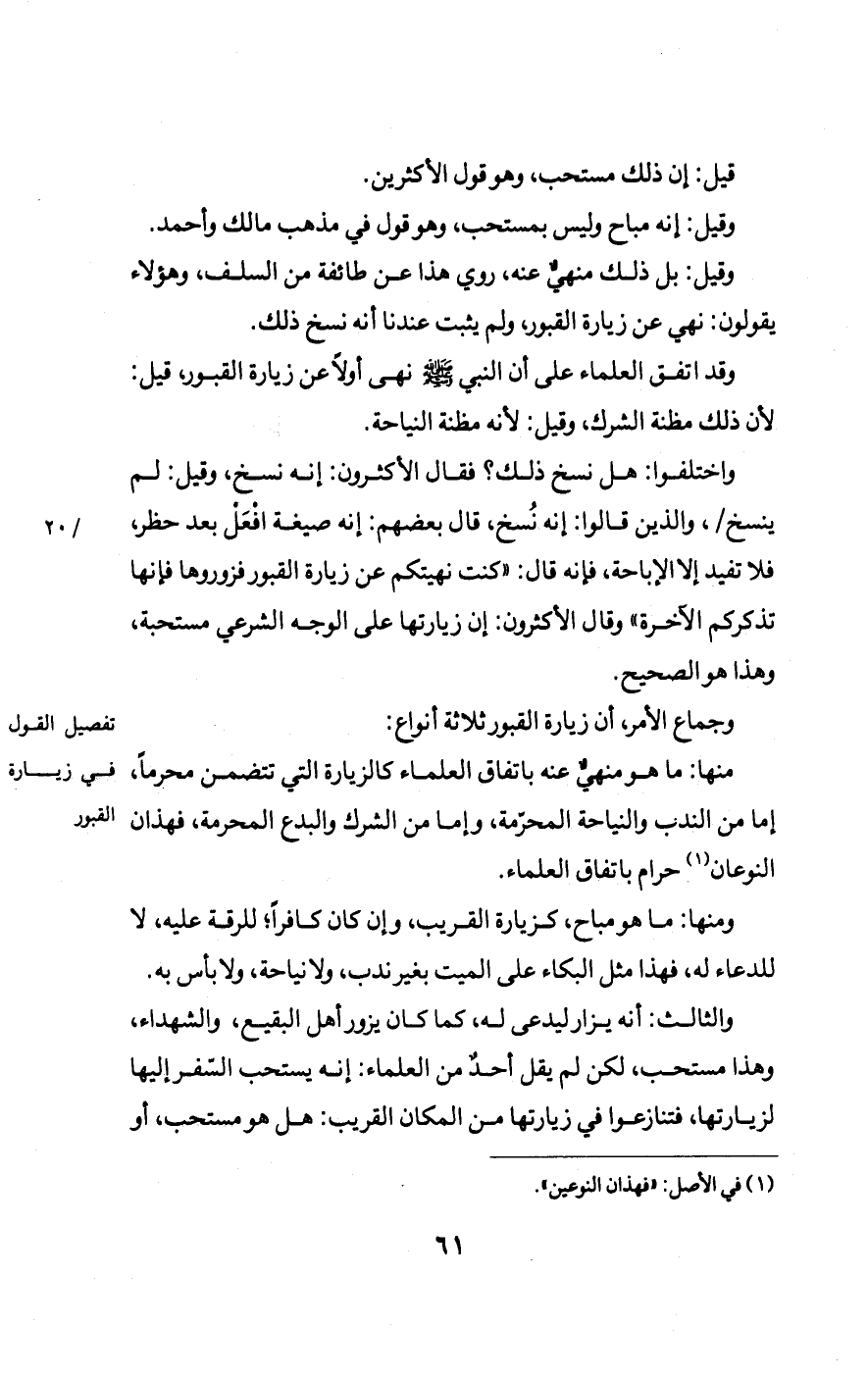 واختلفوا: هل نسخ ذلك؟ فقال الأكثرون: إنه نسخ، وقيل: لم ينسخ، /20أ/ والذين قالوا: إنه نُسخ، قال بعضهم: إنه صيغة افْعَلْ بعد حظر، فلا تفيد إلا الإباحة، فإنه قال: «كُنْتُ نَهَيْتُكُمْ عَنْ زِيَارَةِ الْقُبُورِ فَزُورُوهَا //156أ// فَإِنَّهَا تُذَكِّرُكُمُ الْآخِرَةَ» وقال الأكثرون: إن زيارتها على الوجه الشرعي مستحبةٌ، وهذا هو الصحيح.