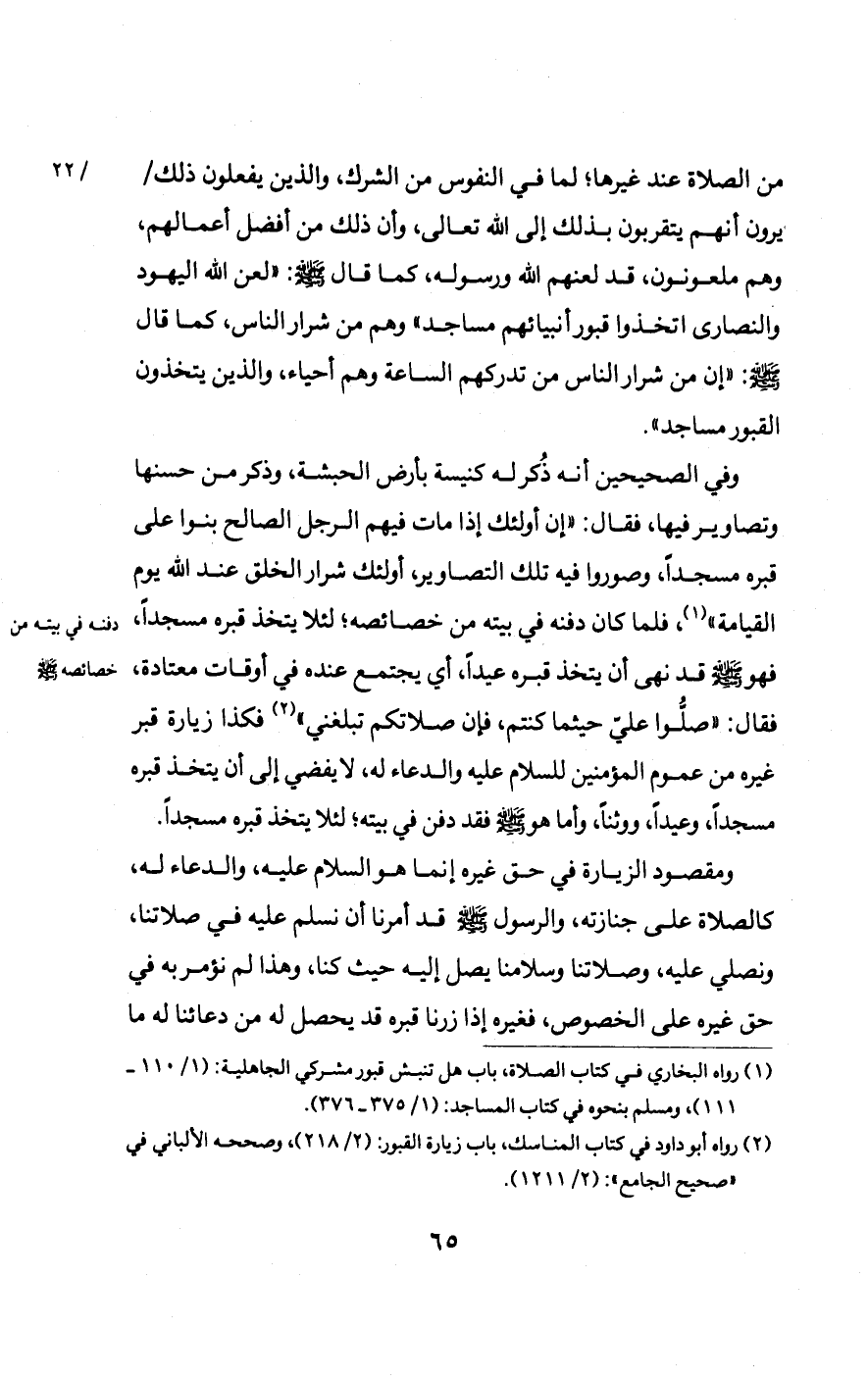 وفي الصحيحين أنه ذُكر له كنيسة بأرض الحبشة، وذكر من حسنها وتصاوير فيها، فقال: «إِنَّ أُولَئِكَ إِذَا مَاتَ فِيهِمُ الرَّجُلُ الصَّالِحُ بَنَوْا عَلَى قَبْرِهِ مَسْجِدًا، وَصَوَّرُوا فِيهِ تِلْكَ التَّصَاوِيرَ، أُولَئِكَ شِرَارُ الْخَلْقِ عِنْدَ اللَّهِ يَوْمَ الْقِيَامَةِ» ، فلما كان دفنه في بيته من خصائصه؛ لئلا يتخذ قبره مسجدًا، فهو صلى الله عليه وسلم قد نهى أن يتخذ قبره عيدًا، أي يجتمع عنده في أوقات معتادة، فقال: «صَلُّوا عَلَيَّ حَيْثُمَا كُنْتُمْ، فَإِنَّ صَلَاتَكُمْ تَبْلُغُنِي» فكذا زيارة قبر غيره من عموم المؤمنين للسلام عليه والدعاء له، لا يفضي إلى أن يتخذ قبره مسجدًا، وعيدًا، ووثناً، وأما هو صلى الله عليه وسلم فقد دفن في بيته؛ لئلا يتخذ قبره مسجدًا.