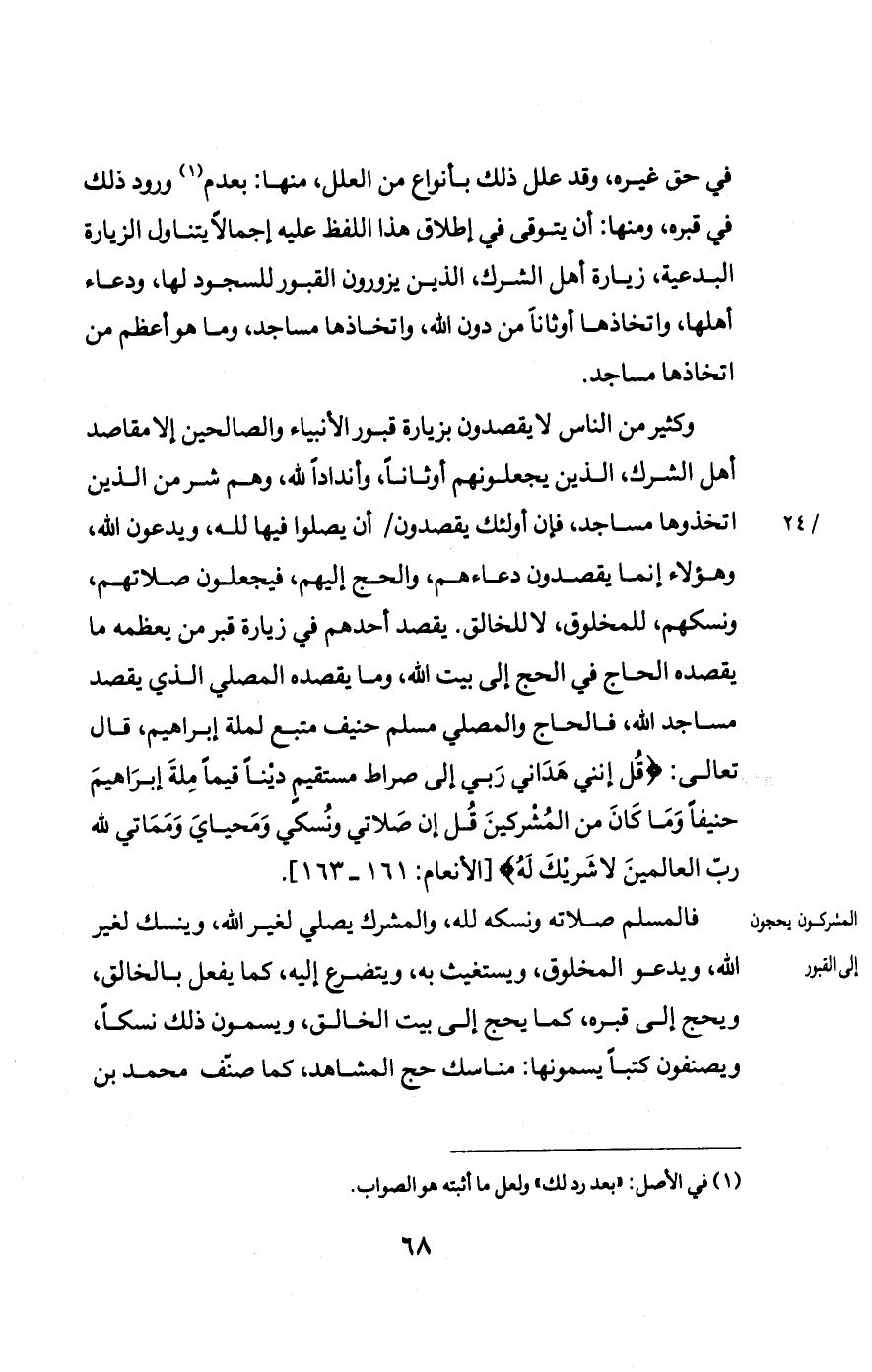 وكثير من الناس لا يقصد بزيارة قبور الأنبياء والصالحين إلا مقاصد أهل الشرك، الذين (¬3) يجعلونهم أوثانًا، وأندادًا لله، وهم شر من الذين اتخذوها مساجد، فإن أولئك يقصدون /24أ/ أن يصلوا فيها لله، ويدعون الله، وهؤلاء إنما يقصدون دعاءهم، والحج إليهم، فيجعلون صلاتهم، ونسكهم، للمخلوق، لا للخالق. يقصد أحدهم في زيارة قبر من يعظمه ما يقصده الحاج في الحج إلى بيت الله، وما يقصده المصلي الذي يقصد مساجد الله، فالحاج والمصلي مسلم حنيف متبع لملة إبراهيم، قال تعالى: {قُلْ إِنَّنِي هَدَانِي رَبِّي إِلَى صِرَاطٍ مُسْتَقِيمٍ دِينًا قِيَمًا مِلَّةَ إِبْرَاهِيمَ حَنِيفًا وَمَا كَانَ مِنَ الْمُشْرِكِينَ • قُلْ إِنَّ صَلَاتِي وَنُسُكِي وَمَحْيَايَ وَمَمَاتِي لِلَّهِ رَبِّ الْعَالَمِينَ • لَا شَرِيكَ لَهُ} [الأنعام: 161-163] .