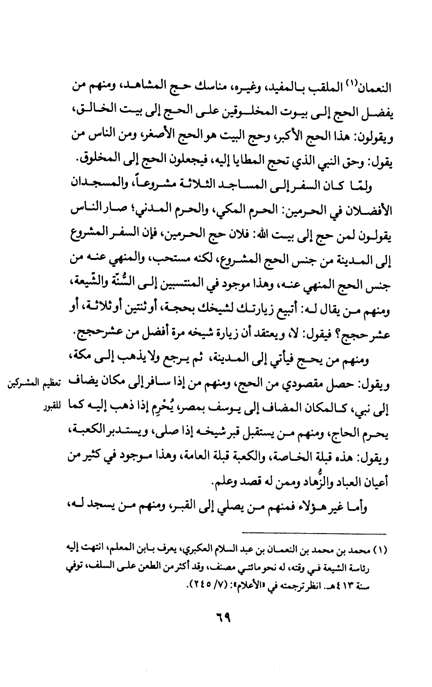 النعمان الملقب بالمفيد، وغيره، مناسك حج المشاهد، ومنهم من يفضل الحج إلى بيوت المخلوقين على الحج إلى بيت الخالق، ويقولون: هذا الحج الأكبر، وحج البيت هو الحج الأصغر، ومن الناس من يقول: وحق النبي الذي تحج المطايا إليه، فيجعلون الحج إلى المخلوق.