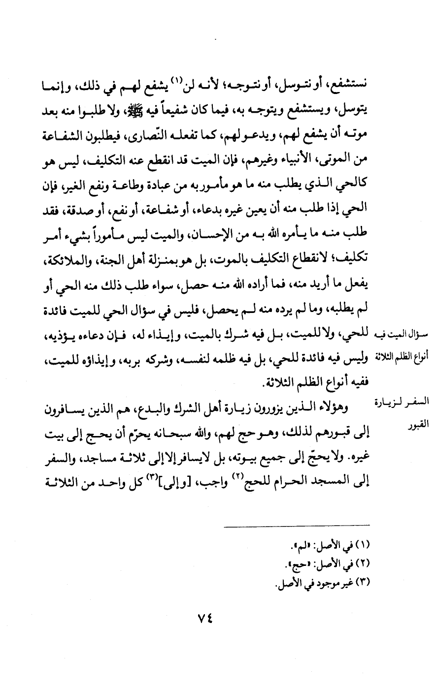 وهؤلاء الذين يزورون زيارة أهل الشرك والبدع، /27ب/ هم الذين يسافرون إلى قبورهم لذلك، وهو حج لهم، والله سبحانه يحرّم أن يحج إلى بيت غيره. ولا يحجّ إلى جميع بيوته، بل لا يسافر إلا إلى ثلاثة مساجد، والسفر إلى المسجد الحرام للحج (¬3) واجب، [وإلى] (¬4) كل واحد من الثلاثة