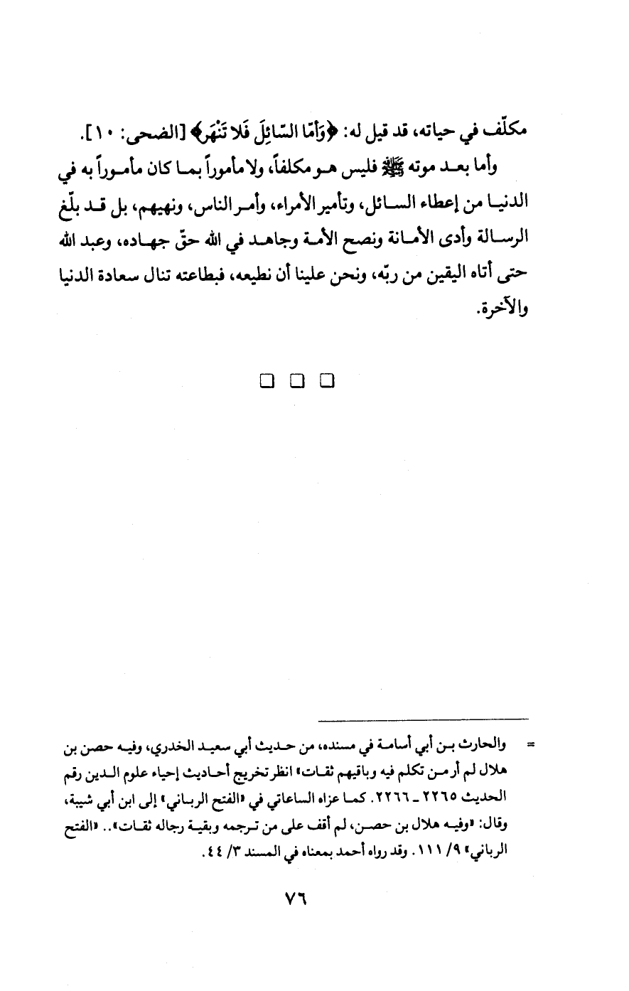 وأما بعد موته صلى الله عليه وسلم فليس هو مكلفًا، ولا مأمورًا بما كان مأمورًا به في الدنيا من إعطاء السائل، وتأمير الأمراء، وأمر الناس، ونهيهم، بل قد بلّغ الرسالة وأدى الأمانة ونصح الأمة وجاهد في الله حقّ جهاده، وعبد الله حتى أتاه اليقين من ربّه، ونحن علينا أن نطيعه، فبطاعته تنال سعادة الدنيا والآخرة.