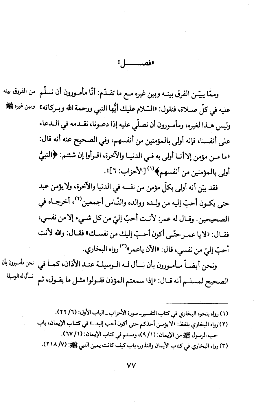 ومما يبيّن الفرق بينه وبين غيره مع ما تقدّم: أنّا مأمورون أن نسلّم عليه في كل صلاة، فنقول: «السَّلَامُ عَلَيْكَ أَيُّهَا النَّبِيُّ وَرَحْمَةُ اللَّهِ وَبَرَكَاتُهُ» وليس هذا لغيره، ومأمورون أن نصلّي عليه إذا دعونا، نقدمه في الدعاء على أنفسنا، فإنه أولى بالمؤمنين من أنفسهم، وفي الصحيح عنه أنه قال: «مَا مِنْ مُؤْمِنٍ إِلَّا أَنَا أَوْلَى بِهِ فِي الدُّنْيَا وَالْآخِرَةِ، اقْرَأُوا إِنْ شِئْتُمْ: {النَّبِيُّ أَوْلَى بِالْمُؤْمِنِينَ مِنْ أَنْفُسِهِمْ} [الأحزاب: 6] » .