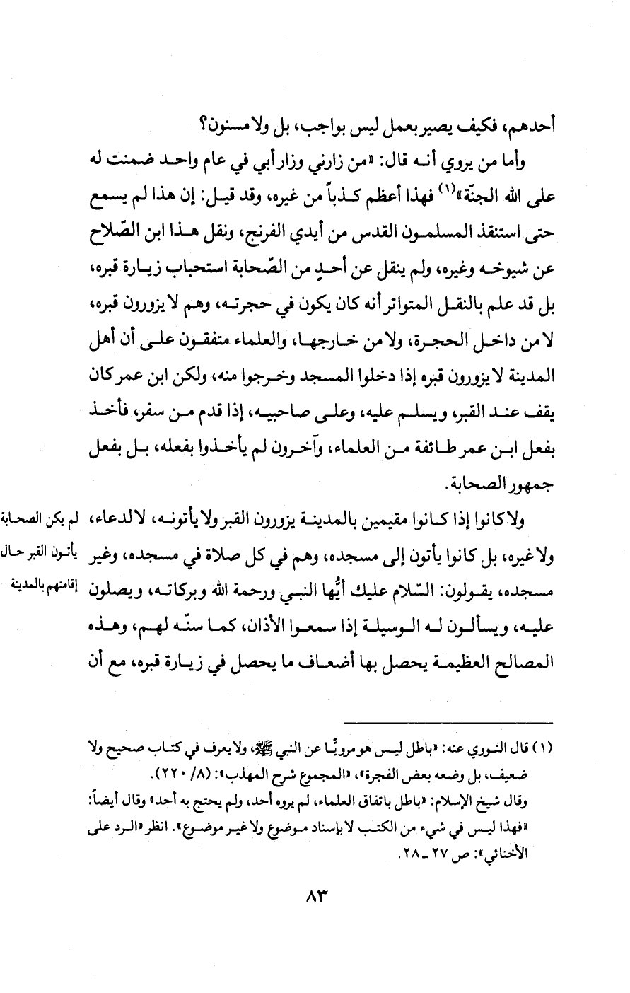 وأما من يروي أنه قال: من زارني وزار أبي في عام واحد ضمنت له على الله الجنة. فهذا أعظم كذبًا من غيره، وقد قيل: إن هذا لم يسمع حتى استنقذ المسلمون القدس من أيدي الفرنج، ونقل هذا ابن الصّلاح عن شيوخه وغيره، ولم ينقل عن أحدٍ من الصّحابة استحباب زيارة قبره، بل قد علم بالنقل المتواتر أنه كان يكون في حجرته، وهم لا يزورون قبره، لا من داخل الحجرة، ولا من خارجها، والعلماء متفقون على أن أهل المدينة لا يزورون قبره إذا دخلوا المسجد وخرجوا منه، ولكن ابن عمر كان يقف عند القبر، ويسلم عليه، وعلى صاحبيه، إذا قدم من سفر، فأخذ بفعل ابن عمر طائفة من العلماء، وآخرون لم يأخذوا بفعله، بل بفعل جمهور الصحابة.