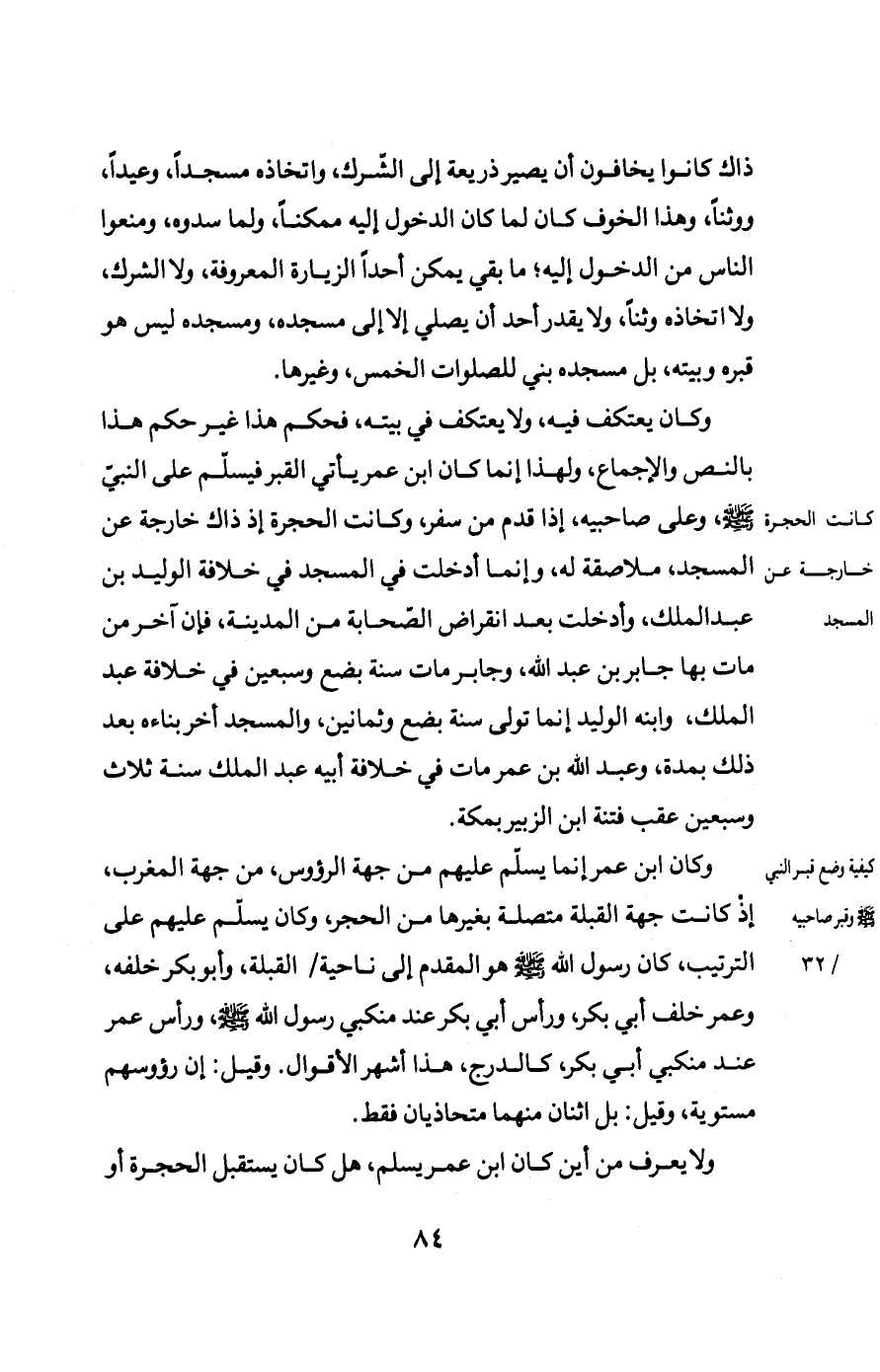 وكان ابن عمر إنما يسلّم عليهم من جهة الرؤوس، من جهة المغرب، إذْ كانت جهة القبلة متصلة بغيرها من الحجر، وكان يسلّم عليهم على الترتيب، كان رسول الله صلى الله عليه وسلم هو المقدم إلى ناحية /32أ/ القبلة، وأبو بكر خلفه، وعمر خلف أبي بكر، ورأس أبي بكر عند منكبي رسول الله صلى الله عليه وسلم، ورأس عمر عند منكبي أبي بكر، كالدرج، هذا أشهر الأقوال. وقيل: إن رؤوسهم مستوية، وقيل: بل اثنان منهما متحاذيان فقط.