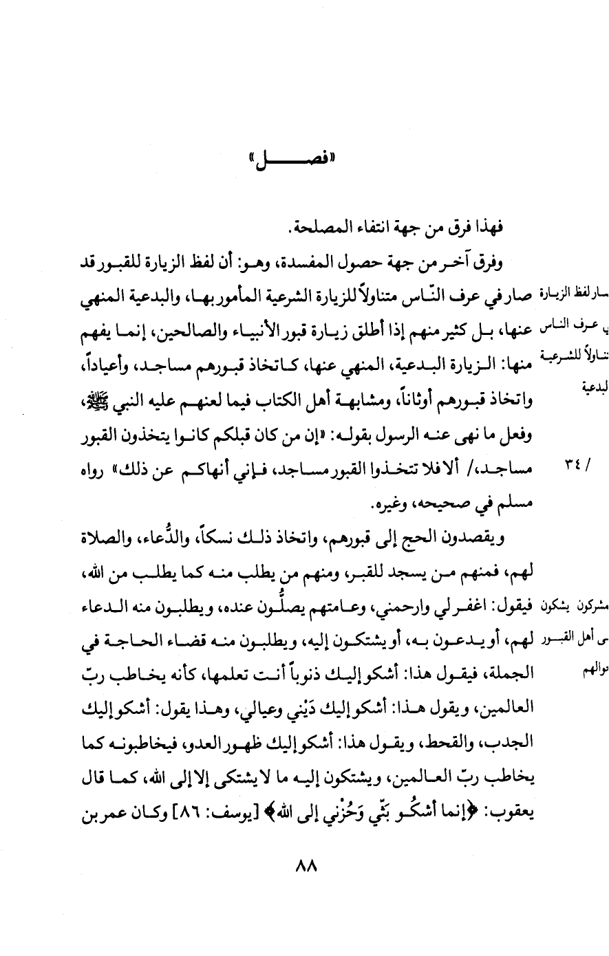 وفرق آخر من جهة حصول المفسدة، وهو أن: لفظ الزيارة للقبور (¬1) قد صار في عرف النّاس متناولاً للزيارة الشرعية المأمور بها، والبدعية (¬2) المنهي عنها، بل كثير منهم إذا أطلق زيارة قبور الأنبياء والصالحين، إنما يفهم منها: الزيارة البدعية، المنهي عنها، كاتخاذ قبورهم مساجد، وأعيادًا، واتخاذ قبورهم أوثانًا، ومشابهة أهل الكتاب فيما لعنهم عليه النبي صلى الله عليه وسلم، وفعل ما نهى عنه الرسول بقوله (¬3) : «إِنَّ مَنْ كَانَ قَبْلَكُمْ كَانُوا يَتَّخِذُونَ الْقُبُورَ مَسَاجِدَ، /34أ/ أَلَا فَلَا تَتَّخِذُوا الْقُبُورَ مَسَاجِدَ، فَإِنِّي أَنْهَاكُمْ عَنْ ذَلِكَ» رواه مسلم في صحيحه (¬4) ، وغيره.