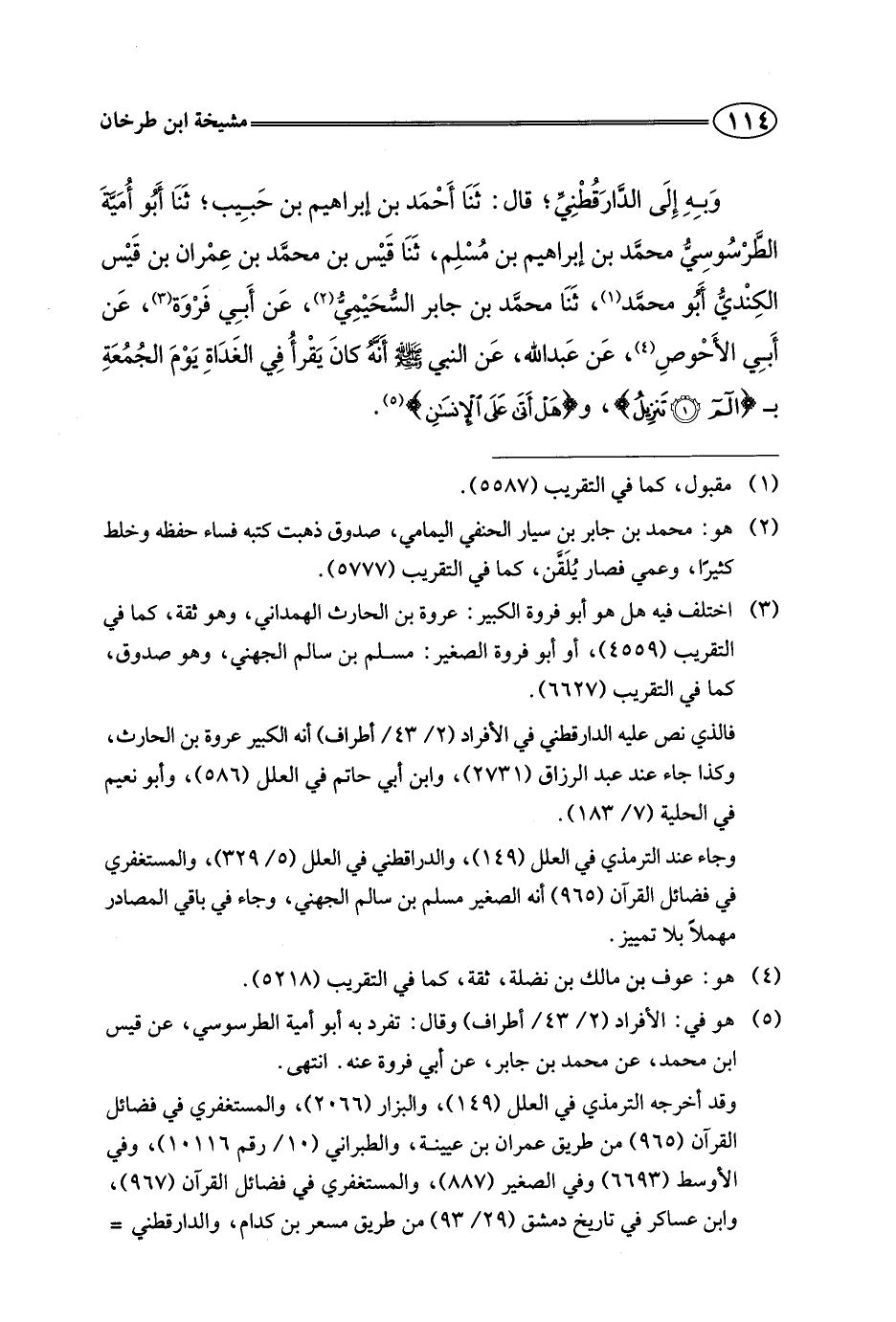 وبه إلى الدارقطني، قال: ثنا أحمد بن إبراهيم بن حبيب، ثنا أبو أمية الطرسوسي محمد بن إبراهيم بن مسلم، ثنا قيس بن محمد بن عمران بن قيس الكندي أبو محمد، ثنا محمد بن جابر السحيمي، عن أبي فروة، عن أبي الأحوص، عن عبد الله، عن النبي صلى الله عليه وسلم أنه كان يقرأ في الغداة يوم الجمعة ب {الم (1) تنزيل} و {هل أتى على الإنسان}.