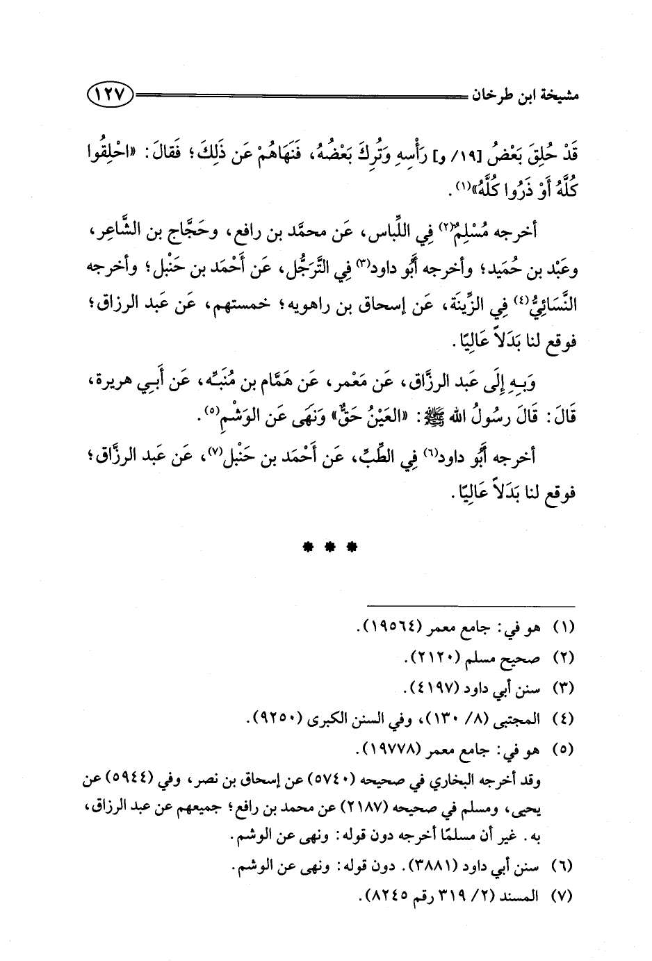 أخرجه مسلم في اللباس، عن محمد بن رافع، وحجاج بن الشاعر، وعبد بن حميد، وأخرجه أبو داود في الترجل، عن أحمد بن حنبل، وأخرجه النسائي في الزينة، عن إسحاق بن راهويه، خمستهم، عن عبد الرزاق، فوقع لنا بدلا عاليا.