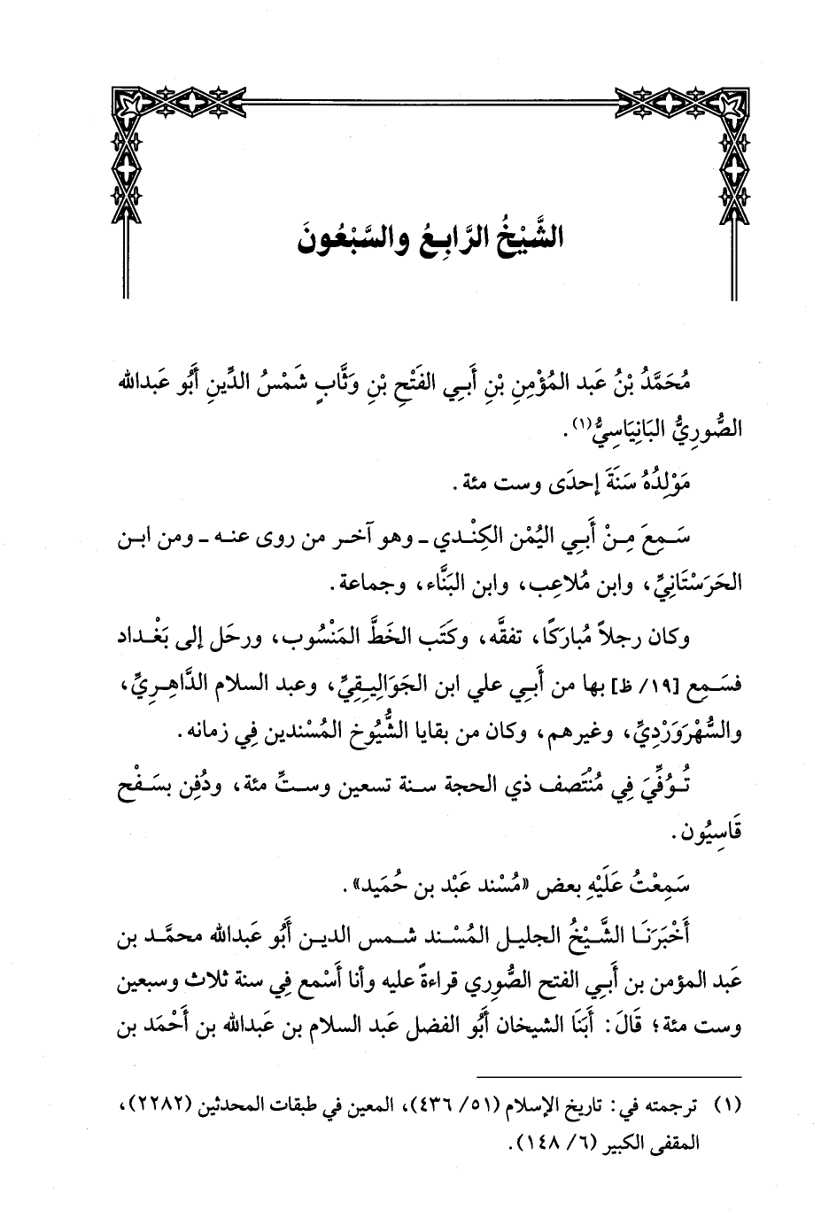 أخبرنا الشيخ الجليل المسند شمس الدين أبو عبد الله محمد بن عبد المؤمن بن أبي الفتح الصوري قراءة عليه وأنا أسمع في سنة ثلاث وسبعين وست مئة، قال: أبنا الشيخان أبو الفضل عبد السلام بن عبد الله بن أحمد بن