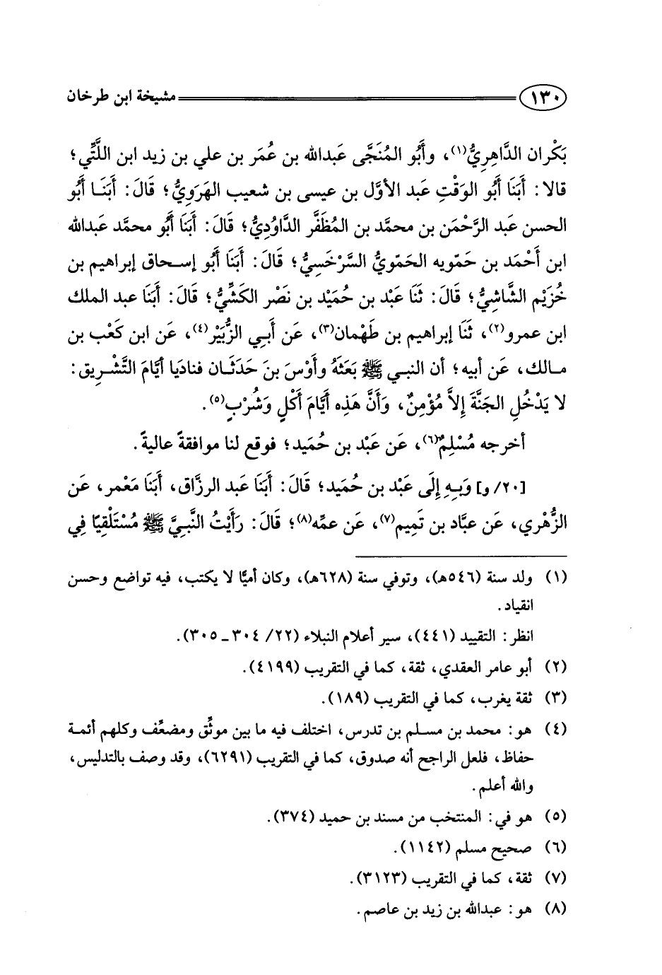 بكران الداهري، وأبو المنجي عبد الله بن عمر بن علي بن زيد ابن اللتي، قالا: أبنا أبو الوقت عبد الأول بن عيسى بن شعيب الهروي، قال: أبنا أبو الحسن عبد الرحمن بن محمد بن المظفر الداودي، قال: أبنا أبو محمد عبد الله بن أحمد بن حمويه الحموي السرخسي، قال: أبنا أبو إسحاق إبراهيم بن خزيم الشاشي، قال: ثنا عبد بن حميد بن نصر الكشي، قال: أبنا عبد الملك بن عمرو، ثنا إبراهيم بن طهمان، عن أبي الزبير، عن ابن كعب بن مالك، عن أبيه، أن النبي صلى الله عليه وسلم بعثه وأوس بن حدثان فناديا أيام التشريق: لا يدخل الجنة إلا مؤمن، وأن هذه أيام أكل وشرب.