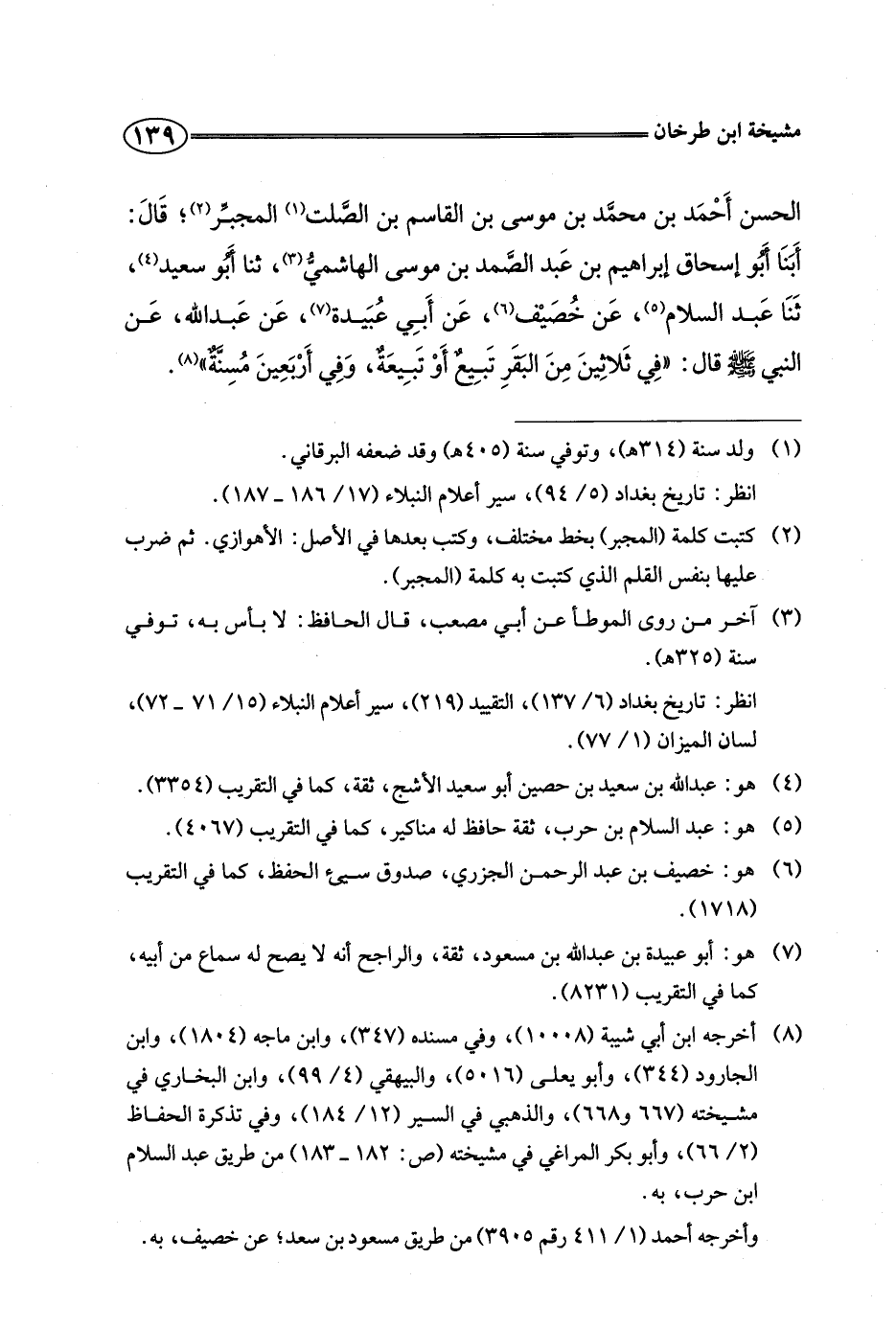 الحسن أحمد بن محمد بن موسى بن القاسم بن الصلت المجبر، قال: أبنا أبو إسحاق إبراهيم بن عبد الصمد بن موسى الهاشمي، ثنا أبو سعيد، ثنا عبد السلام، عن خصيف، عن أبي عبيدة، عن عبد الله، عن النبي صلى الله عليه وسلم قال: "في ثلاثين من البقر تبيع أو تبيعة، وفي أربعين مسنة".