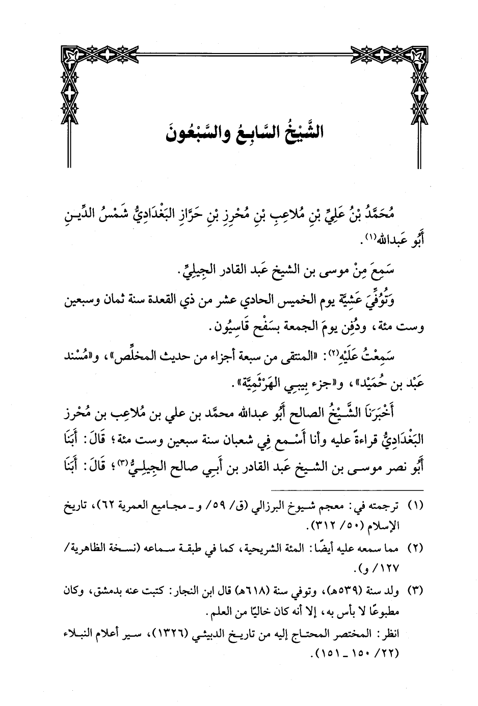 أخبرنا الشيخ الصالح أبو عبد الله محمد بن علي بن ملاعب بن محرز البغدادي قراءة عليه وأنا أسمع في شعبان سنة سبعين وست مئة، قال: أبنا أبو نصر موسى بن الشيخ عبد القادر بن أبي صالح الجيلين، قال: أبنا