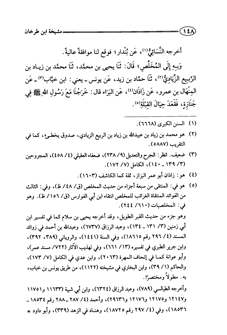 وبه إلى المخلص، قال: ثنا يحيى بن محمد، ثنا محمد بن زياد بن الربيع الزيادي، ثنا حماد بن زيد، عن يونس - يعني: ابن خباب - عن المنهال بن عمرو، عن زاذان، عن البراء قال: خرجنا مع رسول الله صلى الله عليه وسلم في جنازة فقعد حيال القبلة.