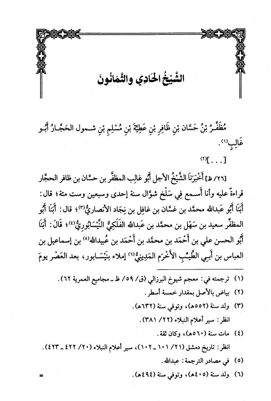 أخبرنا الشيخ الأجل أبو غالب المظفر بن حسان بن ظافر الحجار قراءة عليه وأنا أسمع في سلخ شوال سنة إحدى وسبعين وست مئة، قال: أبنا أبو عبد الله محمد بن غسان بن غافل بن نجاد الأنصاري، قال: أبنا أبو المظفر سعيد بن سهل بن محمد بن عبد الله الفلكي النيسابوري، قال: أبنا أبو الحسن علي بن أحمد بن محمد بن أحمد بن عبيد الله بن إسماعيل بن العباس بن أبي الطيب الأخرم المديني إملاء بنيسابور، بعد العصر يوم