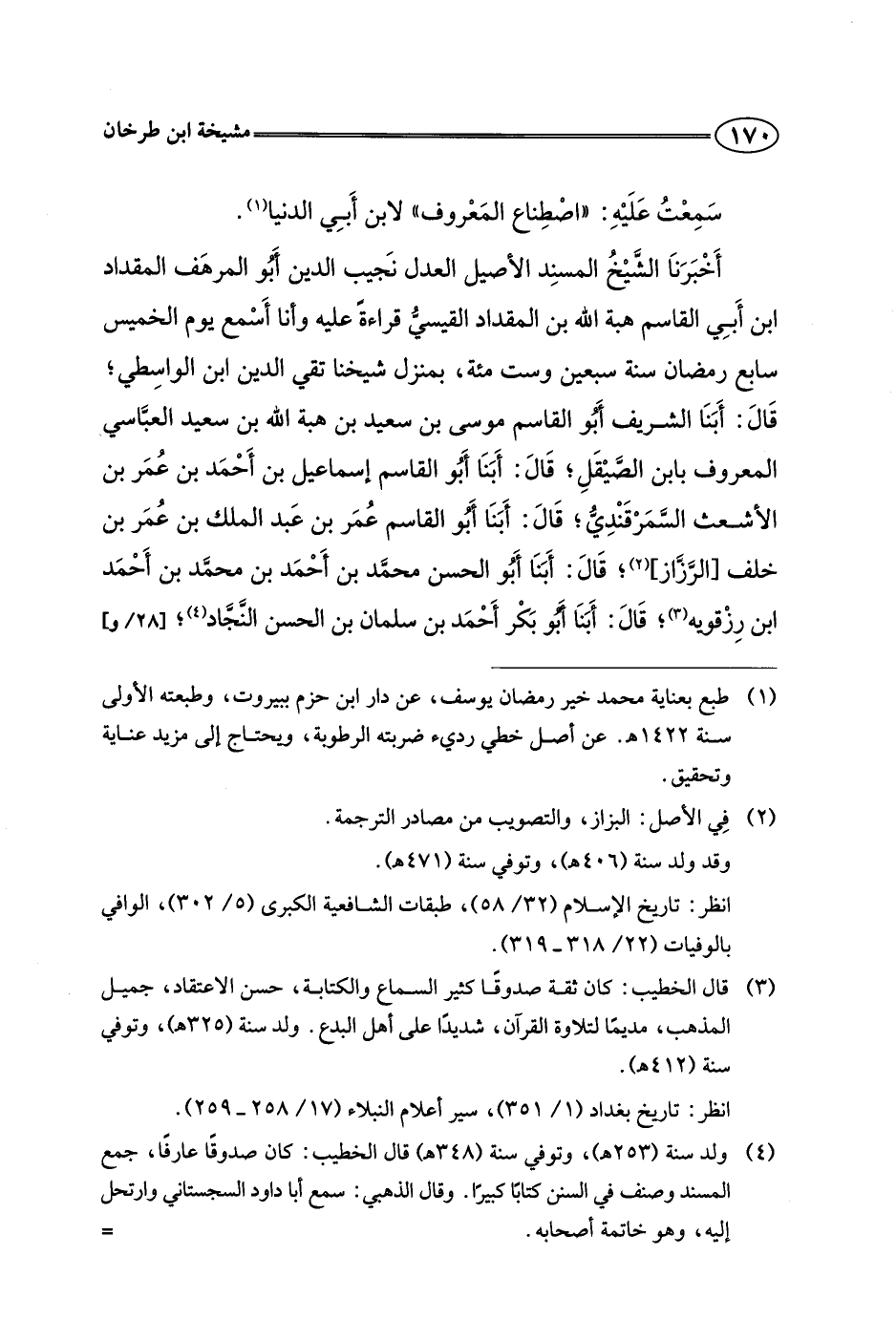 أخبرنا الشيخ المسند الأصيل العدل نجيب الدين أبو المرهف المقداد ابن أبي القاسم هبة الله بن المقداد القيسي قراءة عليه وأنا أسمع يوم الخميس سابع رمضان سنة سبعين وست مئة، بمنزل شيخنا تقي الدين ابن الواسطي، قال: أبنا الشريف أبو القاسم موسى بن سعيد بن هبة الله بن سعيد العباسي المعروف بابن الصيقل، قال: أبنا أبو القاسم إسماعيل بن أحمد بن عمر بن الأشعث السمرقندي، قال: أبنا أبو القاسم عمر بن عبد الملك بن عمر بن خلف [الرزاز]، قال: أبنا أبو الحسن محمد بن أحمد بن محمد بن أحمد بن رزقويه، قال: أبنا أبو بكر أحمد بن سلمان بن الحسن النجاد،