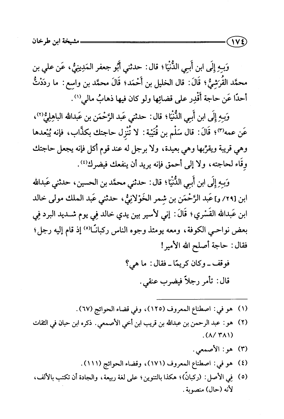 وبه إلى ابن أبي الدنيا، قال: حدثني محمد بن الحسين، حدثني عبد الله بن عبد الرحمن بن شمر الخولاني، حدثني عبد الملك مولى خالد بن عبد الله القسري، قال: إني لأسير بين يدي خالد في يوم شديد البرد في بعض نواحي الكوفة، ومعه يومئذ وجوه الناس ركبانا إذ قام إليه رجل، فقال: حاجة أصلح الله الأمير!