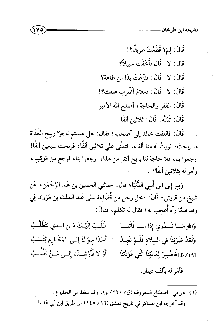 قال: فالتفت خالد إلى أصحابه، فقال: هل علمتم تاجرا ربح الغداة ما ربحت، نويت له مئة ألف، فتمنى علي ثلاثين ألفا، فربحت سبعين ألفا! ارجعوا بنا، فلا حاجة لنا بربح أكثر من هذا، ارجعوا بنا، فرجع من موكبه، وأمر له بثلاثين ألفا.