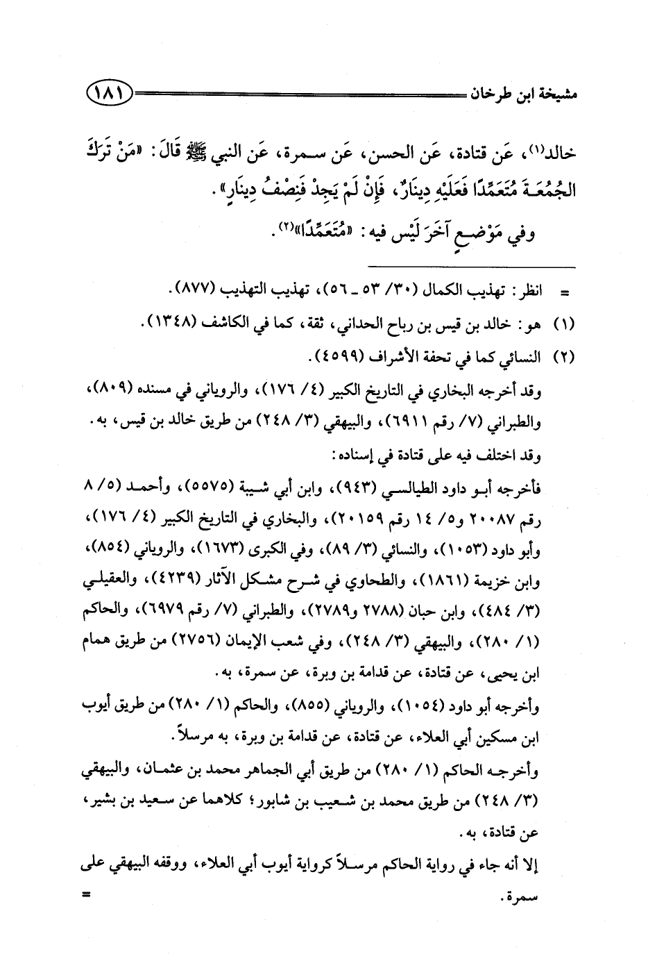 خالد، عن قتادة، عن الحسن، عن سمرة، عن النبي صلى الله عليه وسلم قال: "من ترك الجمعة متعمدا فعليه دينار، فإن لم يجد فنصف دينار".
