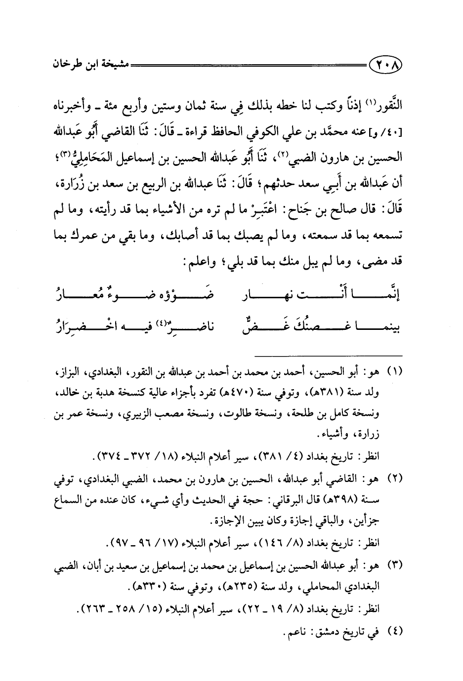 النقور إذنا وكتب لنا خطه بذلك في سنة ثمان وستين وأربع مئة - وأخبرناه عنه محمد بن علي الكوفي الحافظ قراءة - قال: ثنا القاضي أبو عبد الله الحسين بن هارون الضبي، ثنا أبو عبد الله الحسين بن إسماعيل المحاملي، أن عبد الله بن أبي سعد حدثهم، قال: ثنا عبد الله بن الربيع بن سعد بن زرارة، قال: قال صالح بن جناح: اعتبر ما لم تره من الأشياء بما قد رأيته، وما لم تسمعه بما قد سمعته، وما لم يصبك بما قد أصابك، وما بقي من عمرك بما قد مضى، وما لم يبل منك بما قد بلى، واعلم: